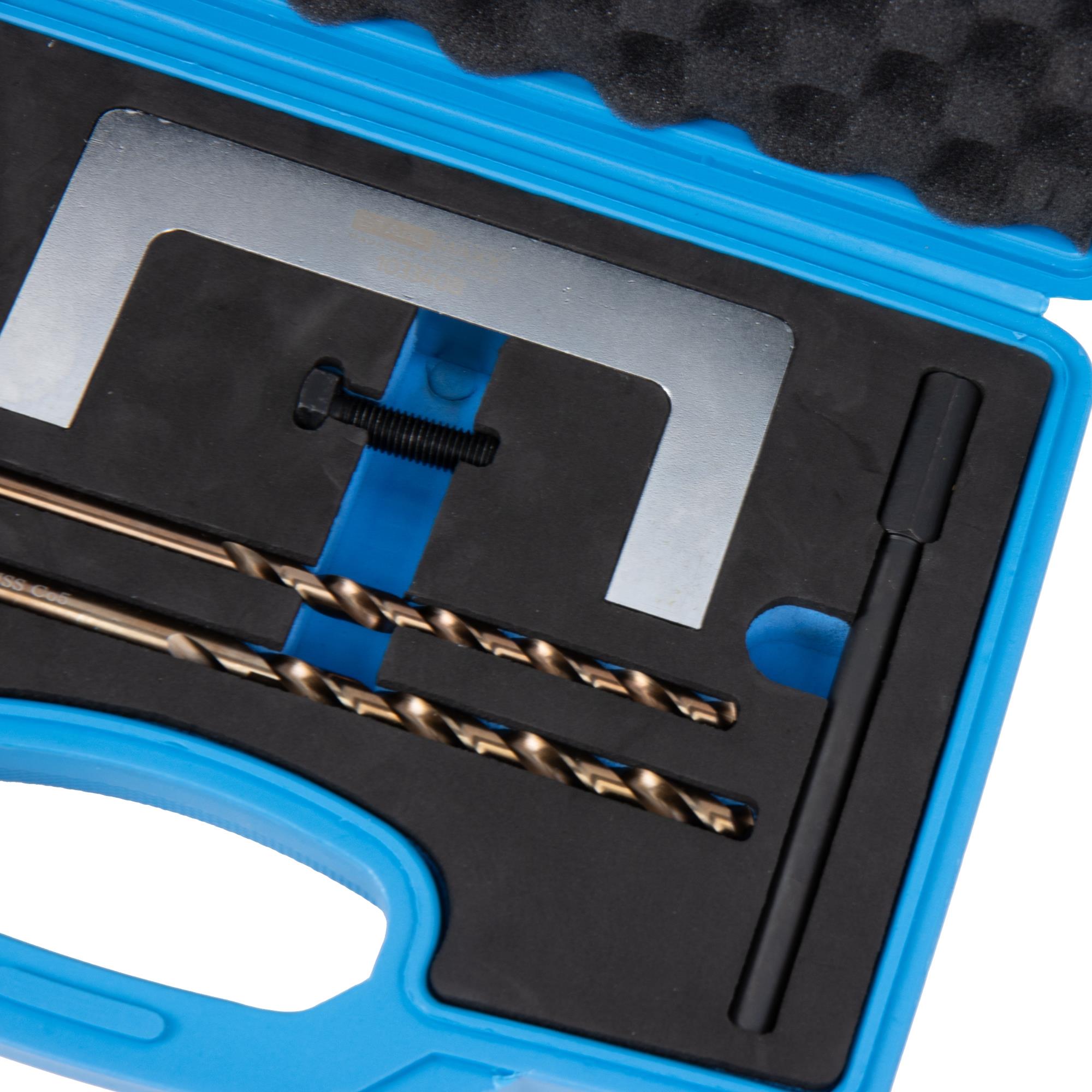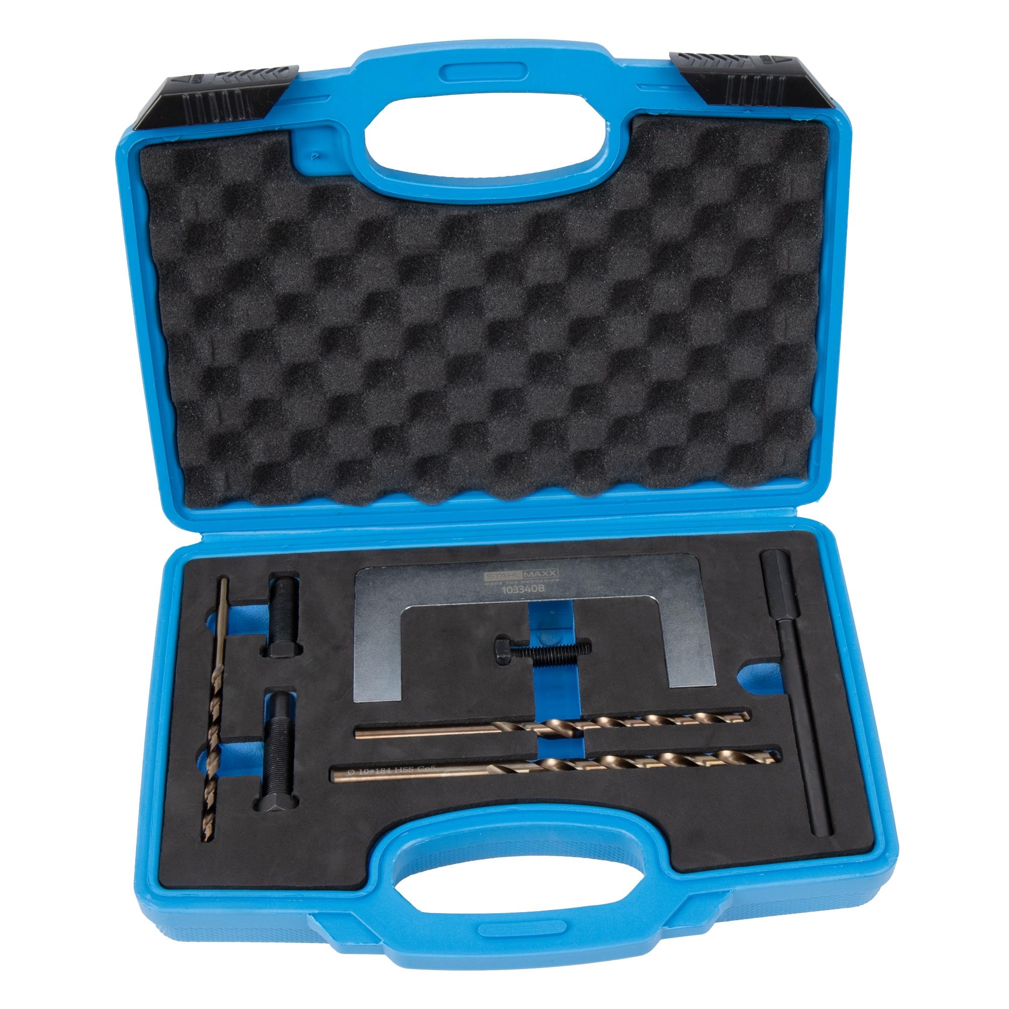 Durch den speziellen Stahlbügel, der in der Spannweite zur Abdeckung der neueren Achskonstruktionen vergrößert wurde, wird, dank der wechselbaren Bohrhülsen, die Schraube mittig über die gesamte Länge, zuerst mit 6 mm und danach mit 8,5 mm, durchbohrt.