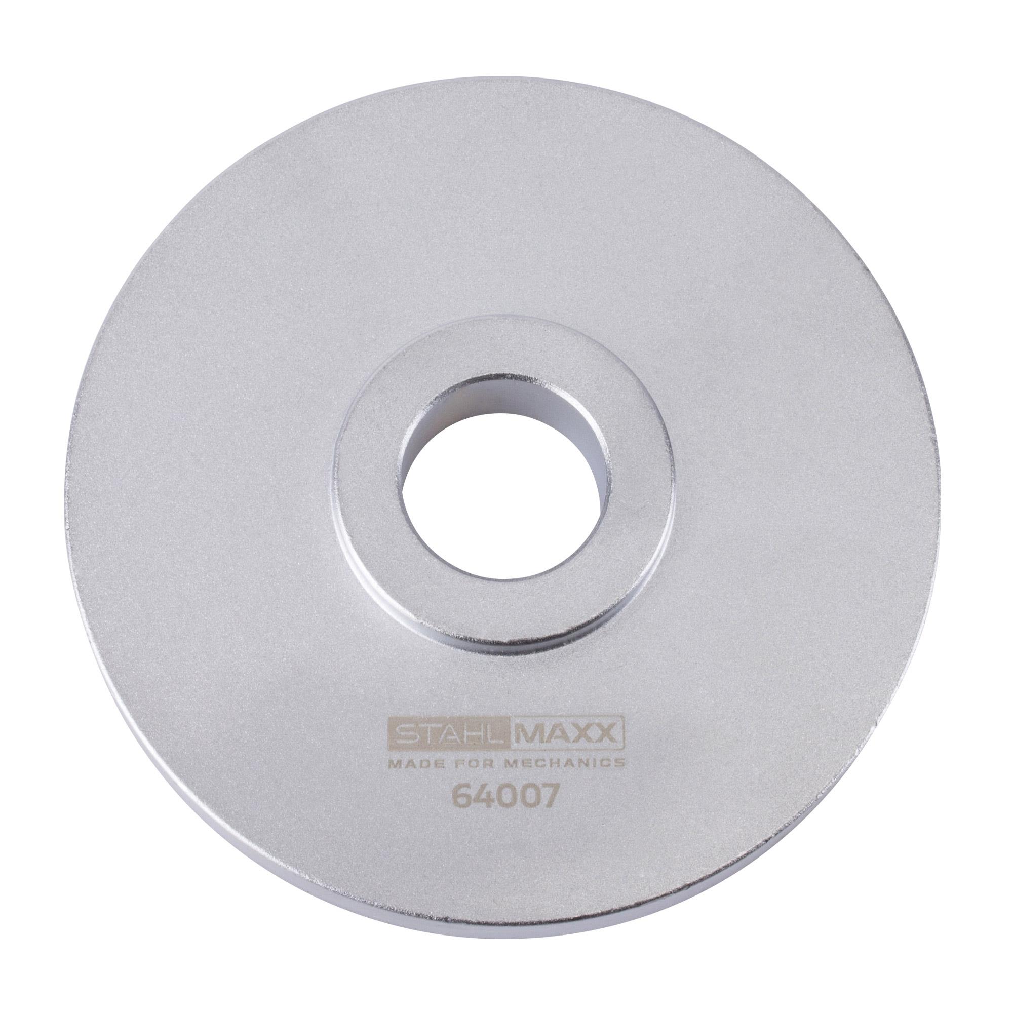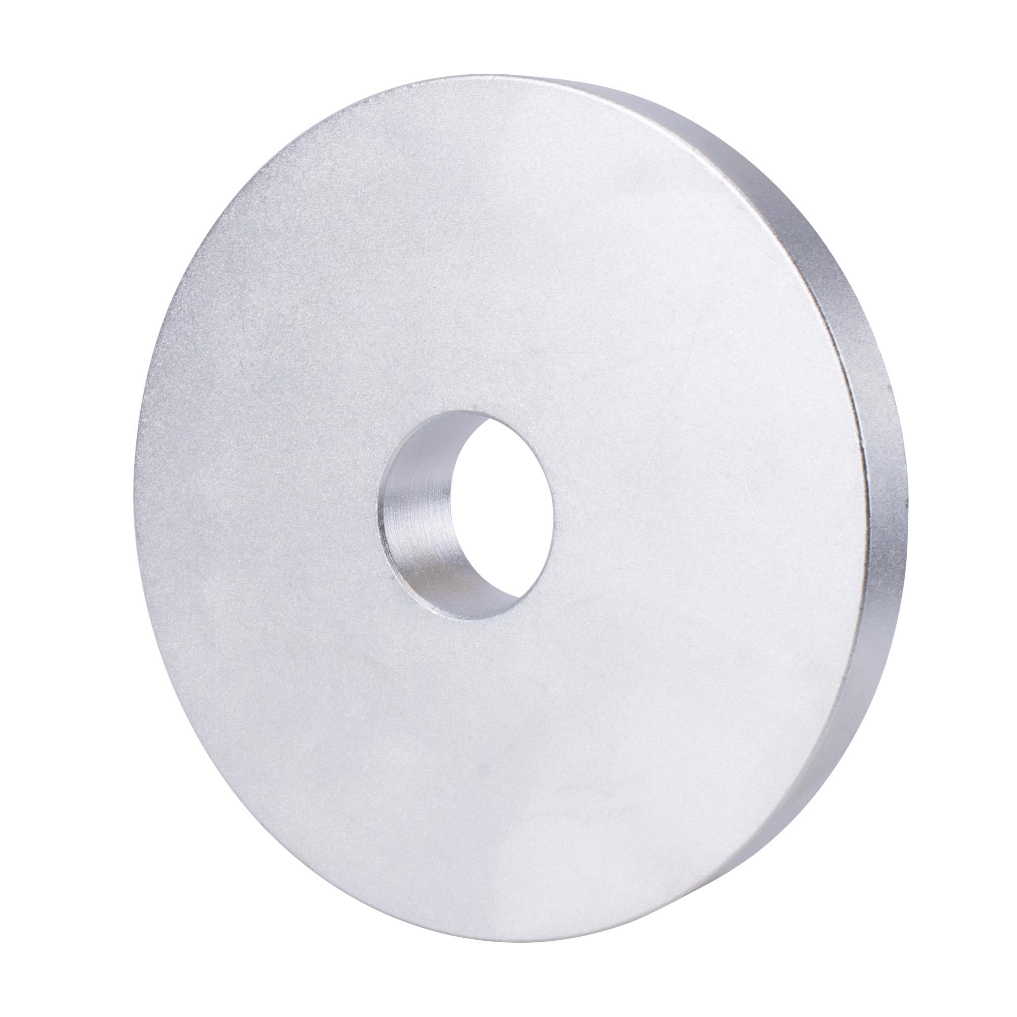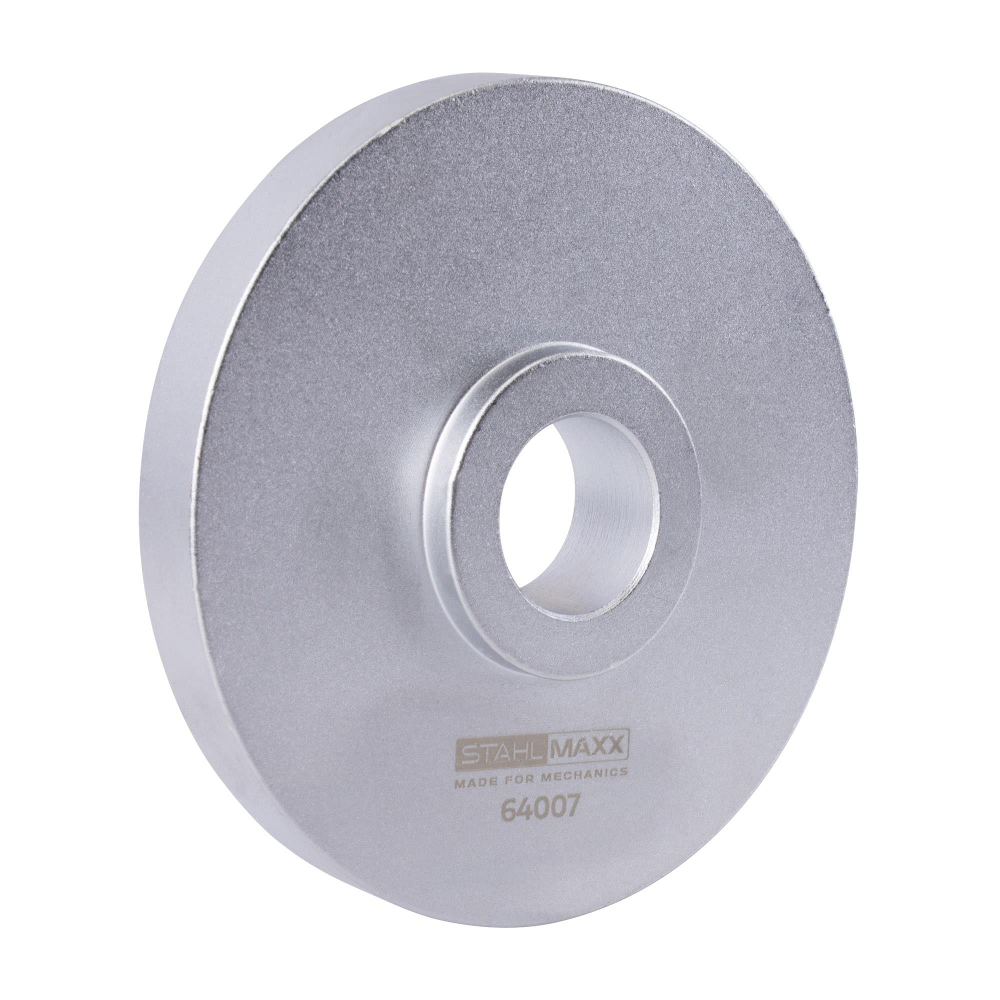 Adapterscheibe zum Einsetzen in das C-förmige Unterteil des Pressrahmens Art.-Nr. 117765. Dient zur zentrierten Aufnahme von Universal- und spezifischen Zug- und Druckhülsen z.B. aus Art.-Nr. 117908 mit einem Zentrierdurchmesser von 35 mm.