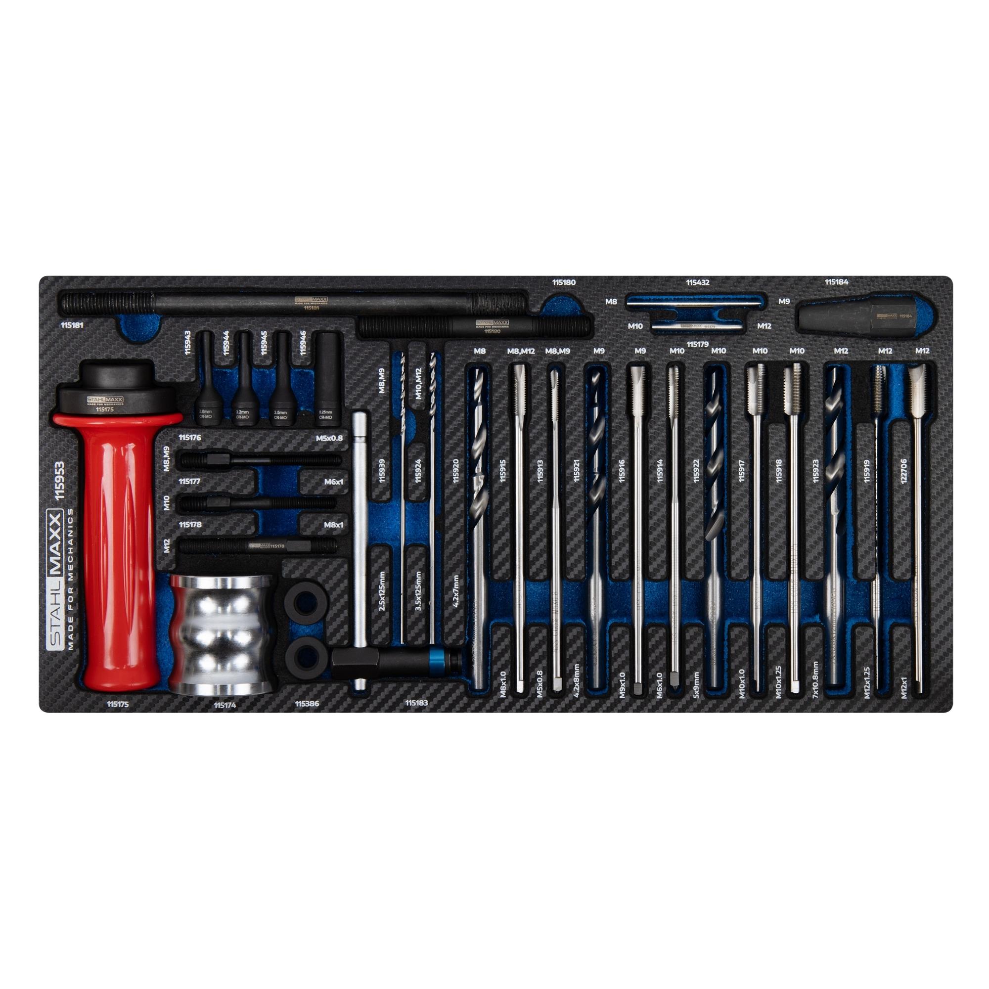 Auch für den Fall eines defekten Glühkerzengewindes, sind in unserem Werkzeugsatz der passende Spiralbohrer und Gewindebohrer zum Einsetzen einer Gewinde-Reparaturhülse enthalten.