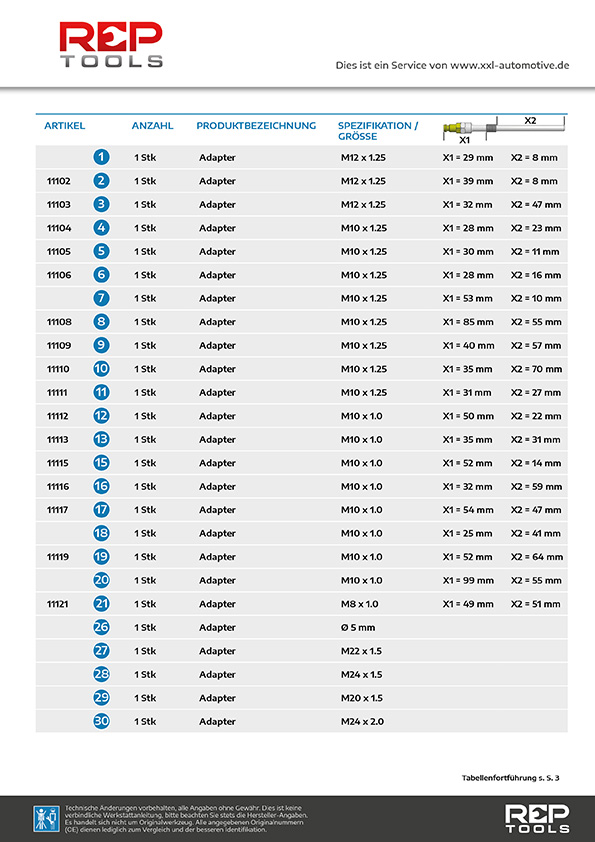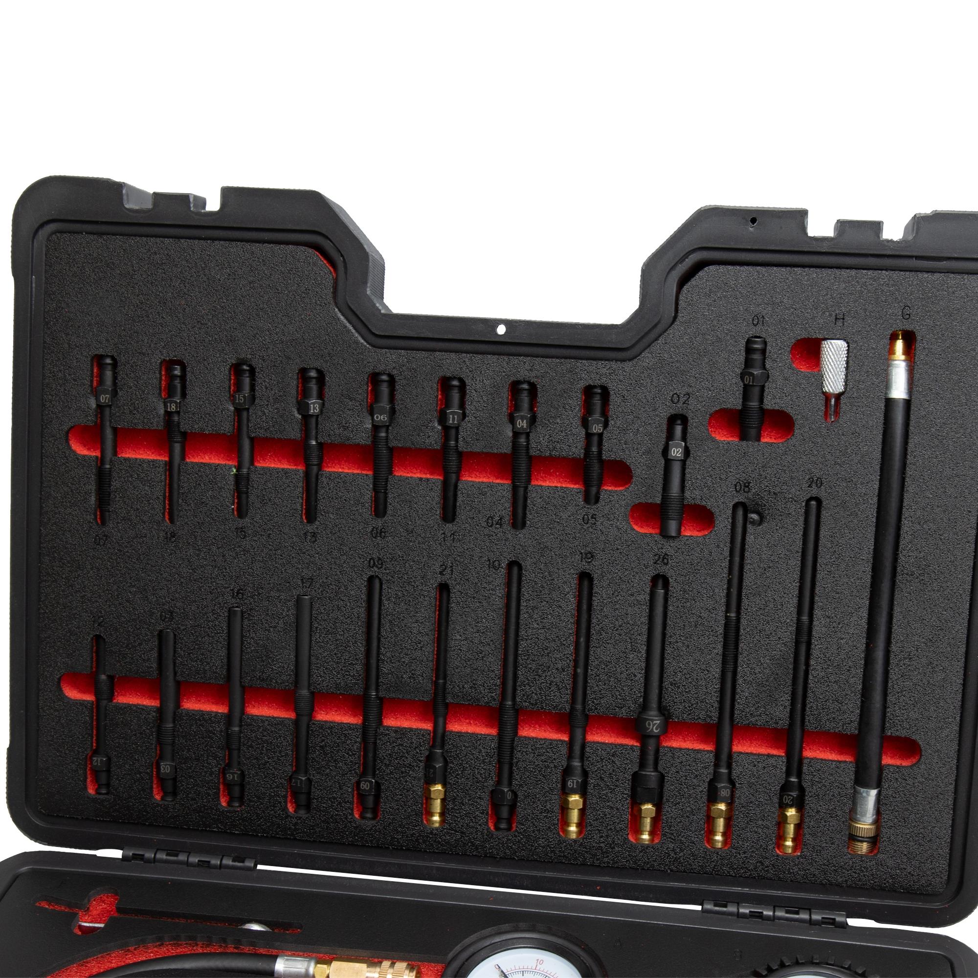 Im Werkzeugsatz sind 21 Standard Glühkerzen-Adapter für eine Vielzahl von Dieselmotoren enthalten. Hiermit wird über den Glühkerzenschacht die Kompression bestimmt.