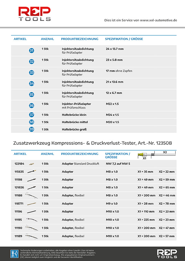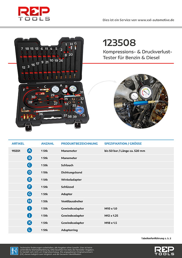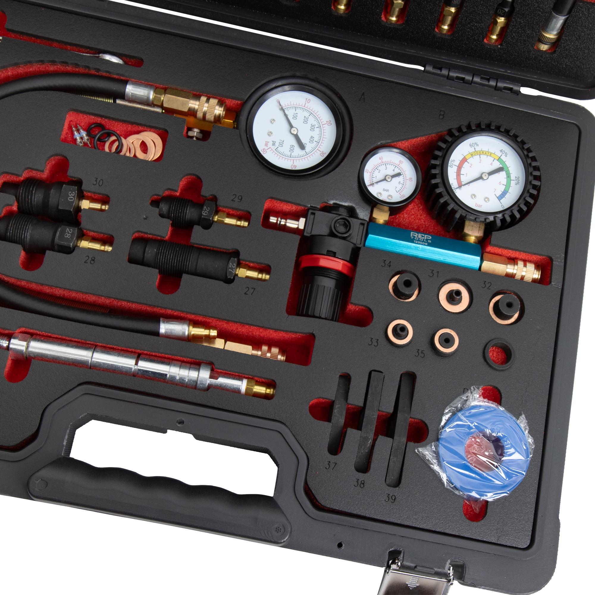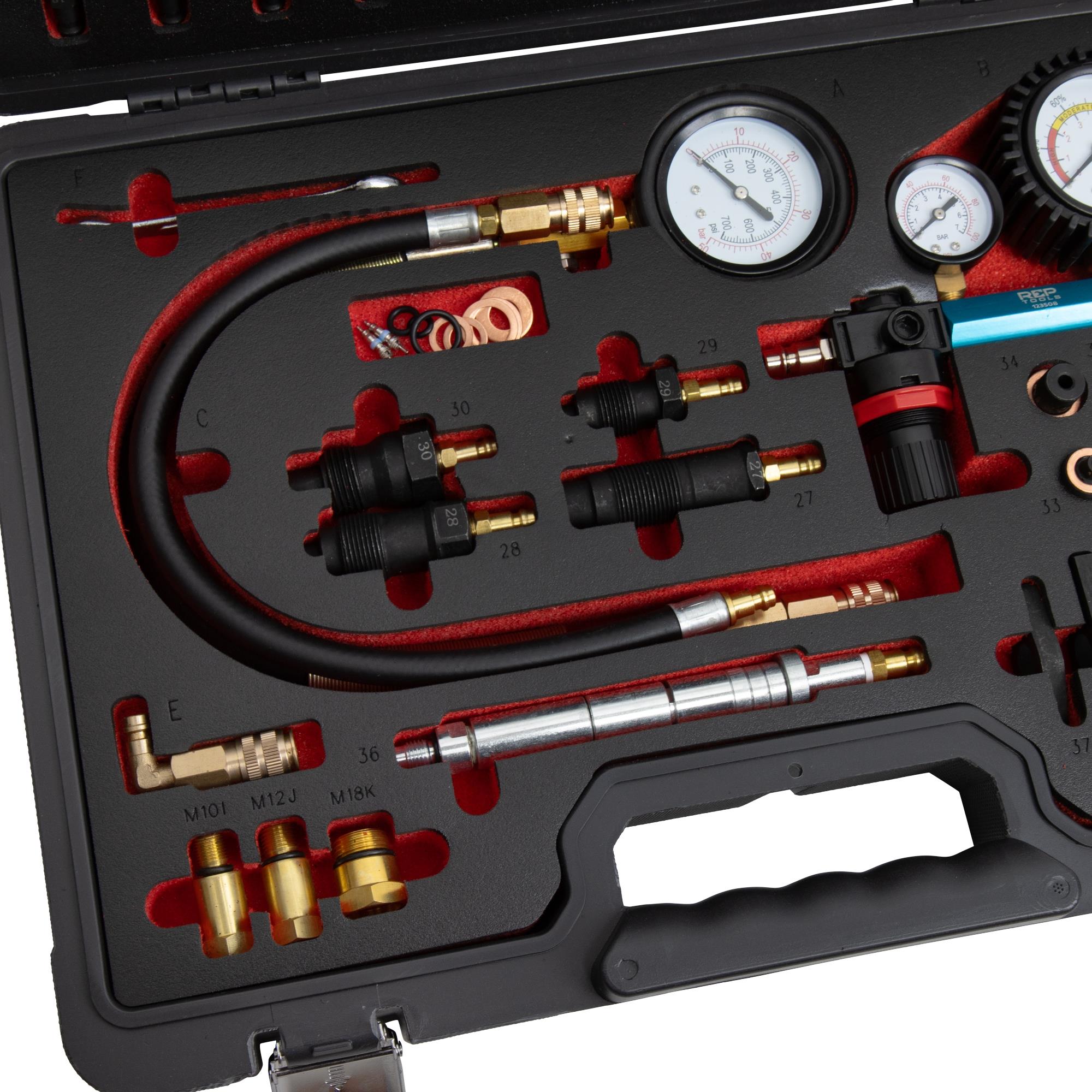 Spezialwerkzeug-Satz zur Prüfung der Kompression und zur Motor-Zustandsbeurteilung mittels Druckverlust von REPTOOLS.