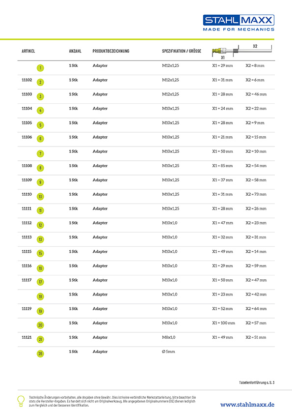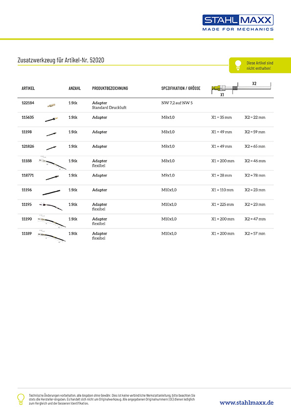 Viele weitere Kompressionsadapter und einen Steckverbinder zum Adaptieren auf Druckluftschnellkupplung finden Sie unter dem Abschnitt Zusatzwerkzeuge.