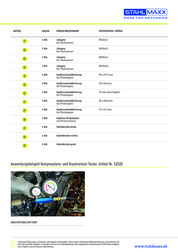 Das STAHLMAXX-Qualitäts-Spezialwerkzeug eignet sich zur Prüfung von Kompression und zur Motor-Zustandsbeurteilung mittels Druckverlust. Verwendbar für nahezu alle Benzin-, Diesel-, Oldtimer- und Industriemotoren. Alle Komponenten sind für den jahrzehntelangen, reibungslosen, professionellen Einsatz konzipiert – z. B. verwenden wir für dieses Sortiment nur absolut hochwertige Komponenten, wie Manometer, Druckschläuche, Ventile und Kupplungen. In jedem Glühkerzen-Stabadapter befindet sich ein Druckausgleichsventil. Dieses begrenzt den Kompressionsraum und verhindert ein "Schlagen" des Manometers, was für eine aussagekräftige Messung unabdingbar ist. Glühkerzenadapter von günstigen Sätzen haben diese oftmals nicht und sind nur hohlgebohrt.