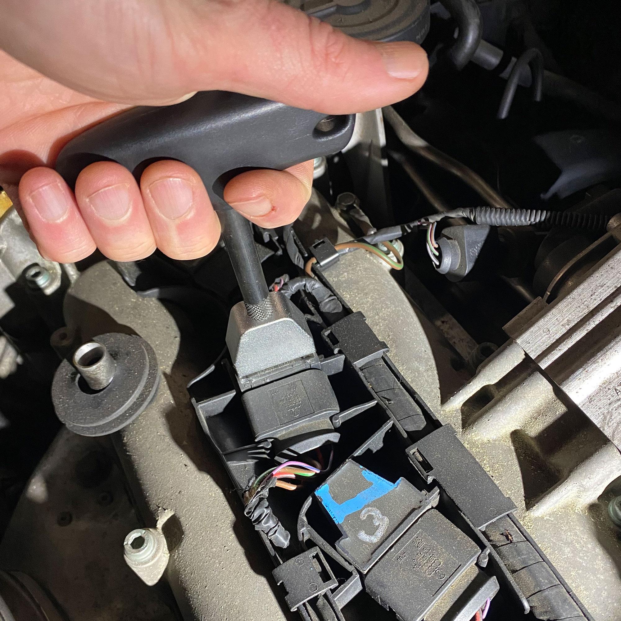 Zum beschädigungsfreien Abziehen von Zündkerzensteckern / Zündspulen mit Leistungsendstufe bei VW, Skoda, Audi Motoren.
