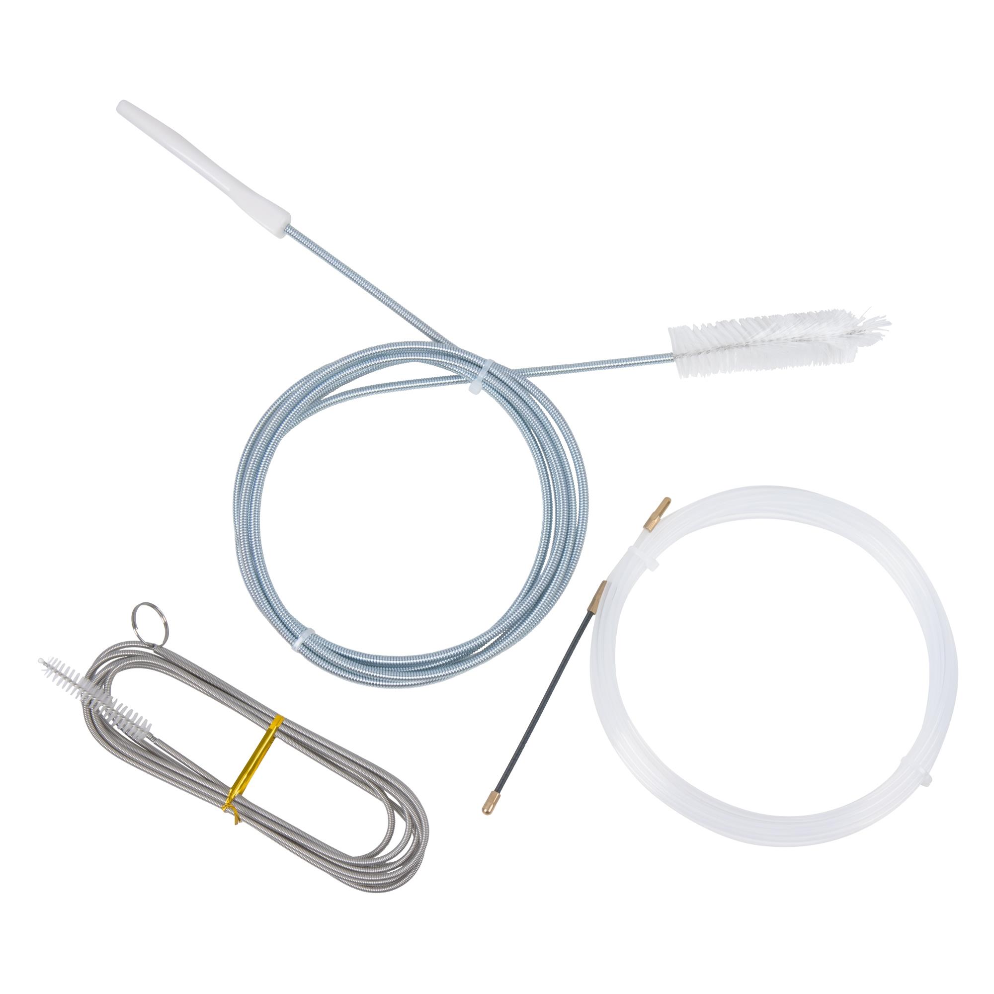 - Jeweils einer flexiblen, mit Nylon besetzten Bürste, mit einem Durchmesser von 13 mm und 22 mm. Angebracht an einer flexiblen Welle aus Edelstahl mit 2,5 m Länge. Diese eignen sich zur Reinigung von Abläufen, Schläuchen und Rohrleitungen die mit Ablagerungen verschmutzt sind.
