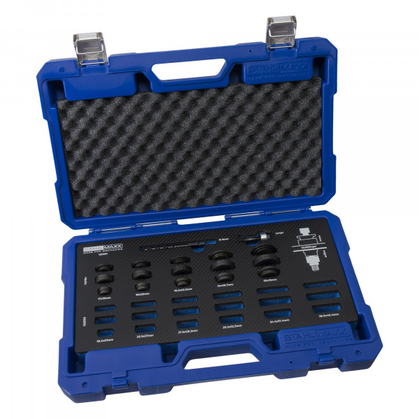 Mit dem Werkzeug Satz lassen sich die Durchmesser 17 mm, 18 mm, 18,2 mm, 19 mm, 20 mm, 22,5 mm, 24 mm, 26 mm, 26,7 mm und 32 mm stanzen, um den passenden Sensor für die Einparkhilfe einzusetzen. Durch die kompakte Form des Werkzeuges, lässt sich dieses auch bei Stoßstangen mit Innenaufbau verwenden.