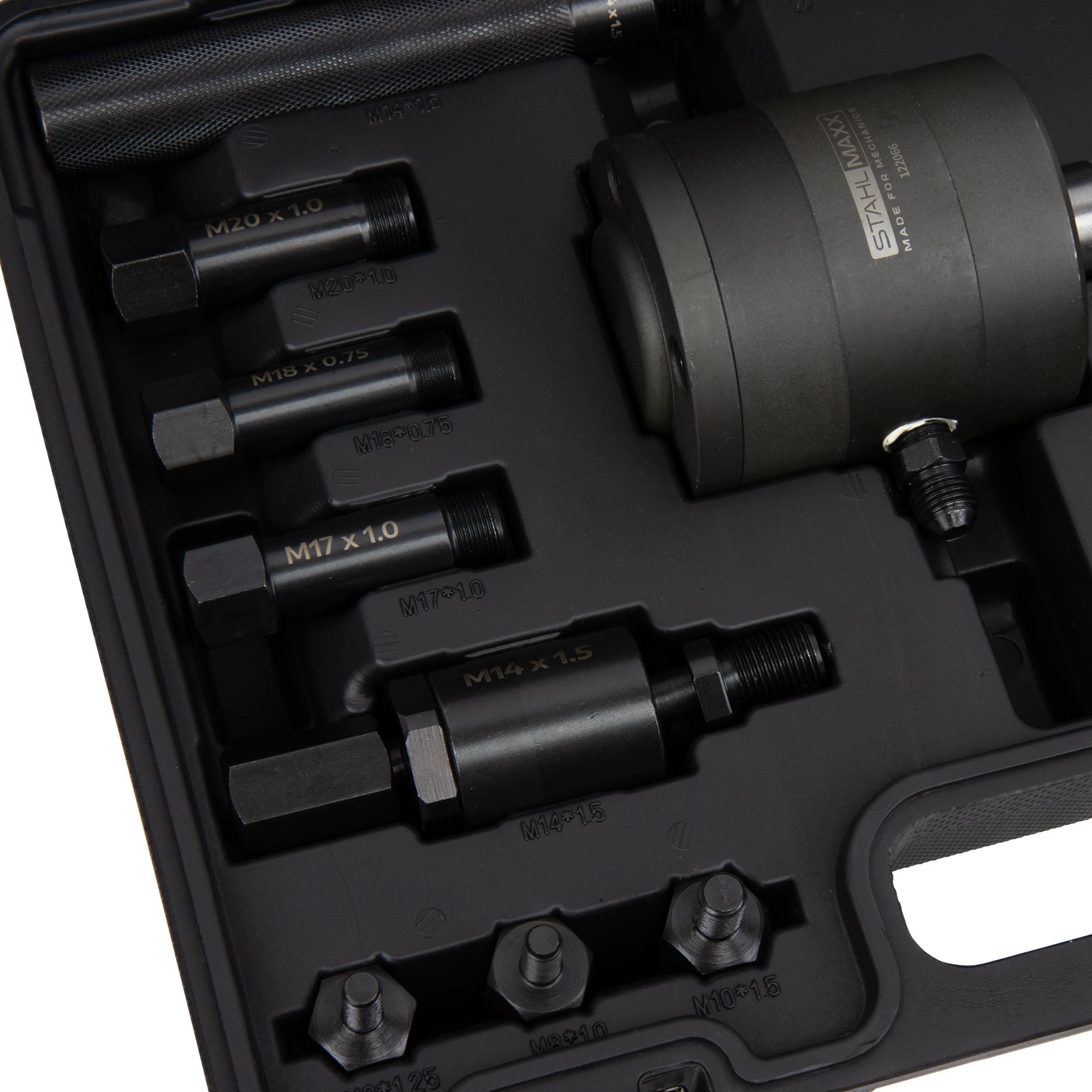 Für spezielle Platzverhältnisse, wie z.B. bei Transportern oder unter der Spritzwand sitzenden Einspritzdüsen, haben wir exklusiv einen Gewindeadapter mit Feststellfunktion ins Set integriert. Dieses Set stellt somit die effektivste und universellste Lösung zum Entfernen von Injektoren und Einspritzdüsen dar.