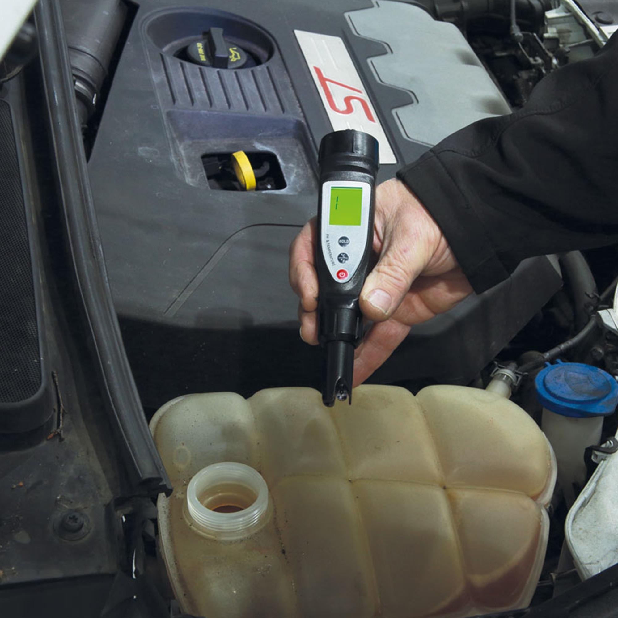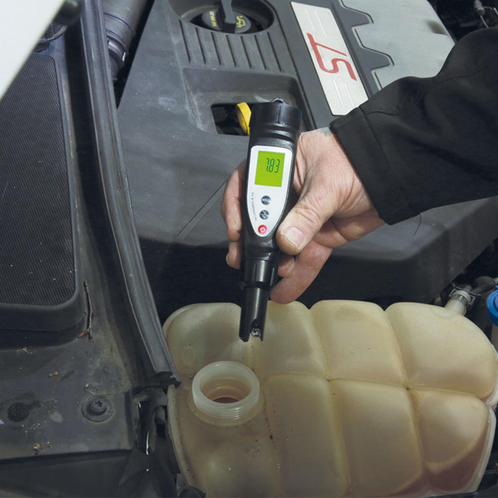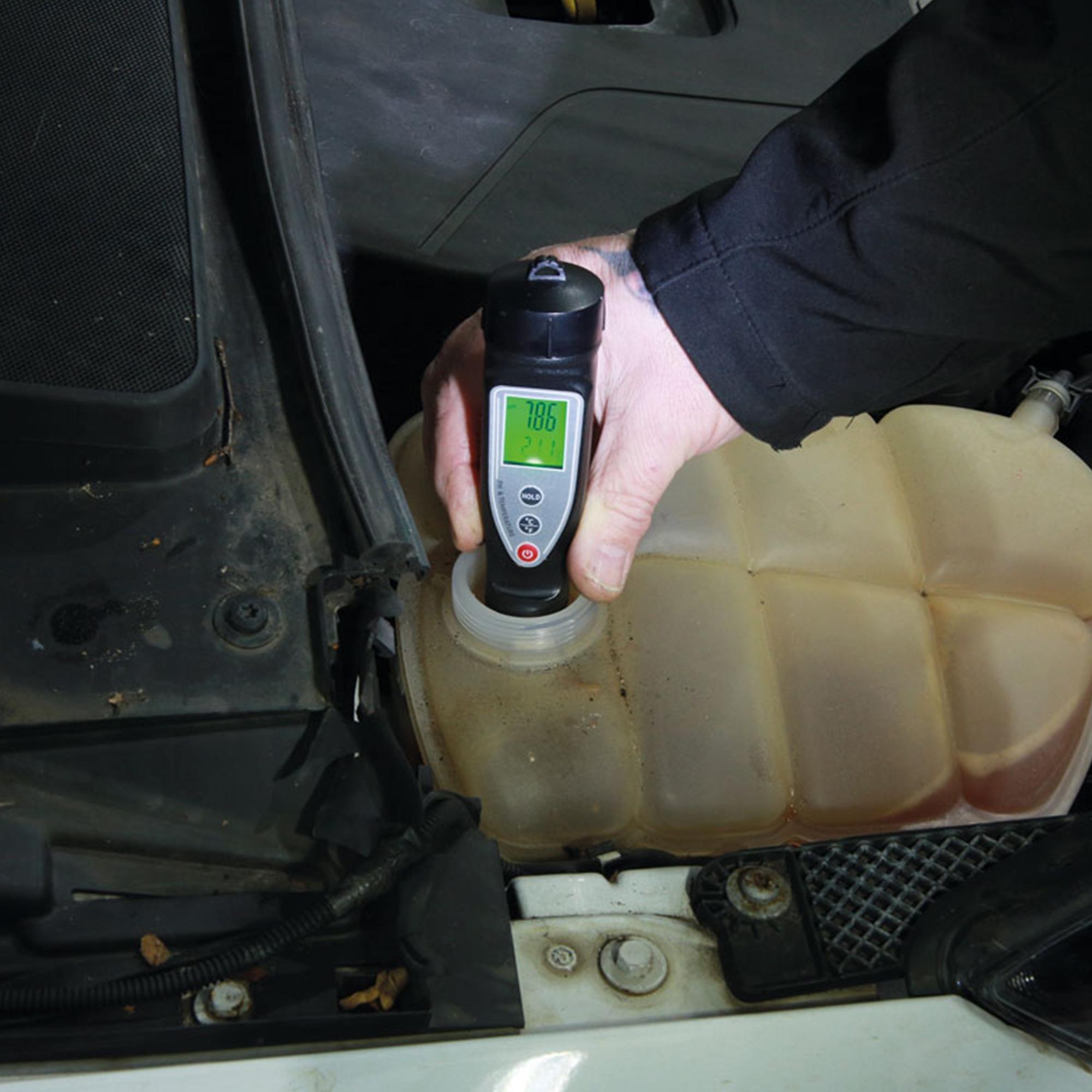 Das eingeschaltete Gerät mit der Messsonde in den Ausgleichsbehälter eintauchen und im Kühlmittel leicht bewegen.