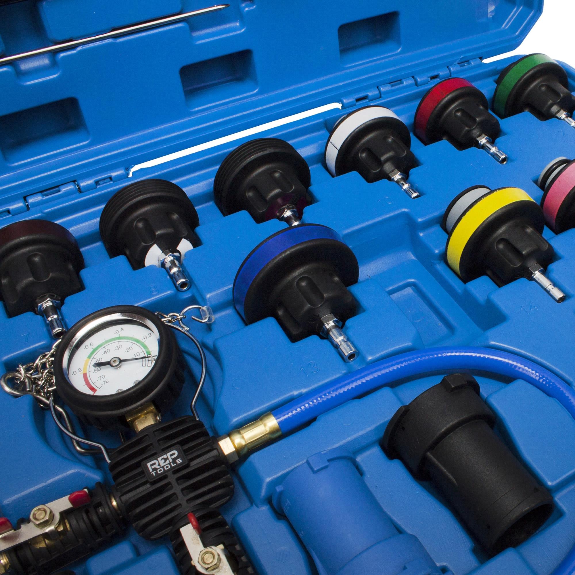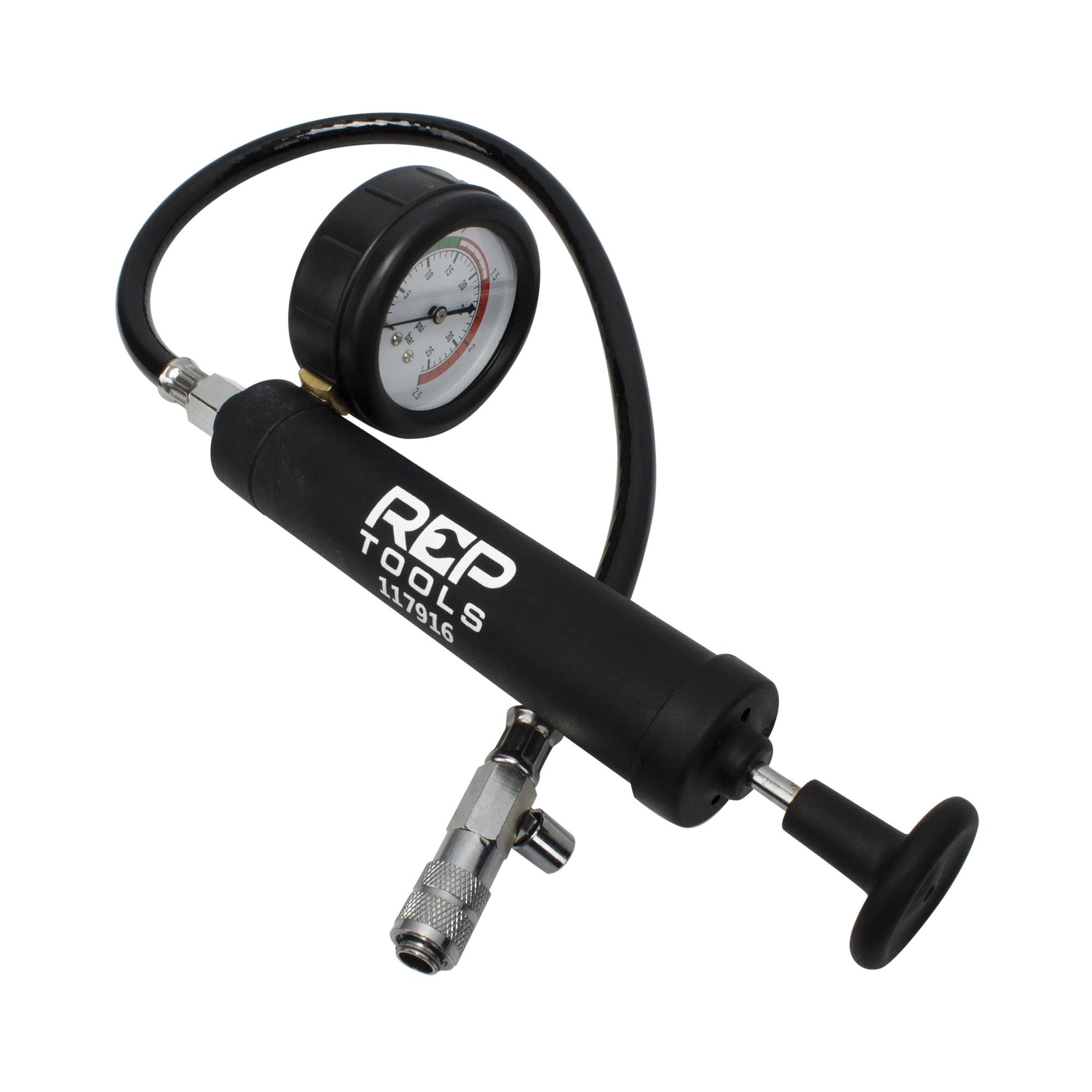 Mit der beiliegenden Handpumpe und dem passenden Adapter für den Kühler oder Ausgleichsbehälter wird ein Überdruck im Kühlsystem erzeugt. Durch den Druckabfall im eingebauten Manometer werden Lecks oder Undichtigkeiten im Kühlkreislauf angezeigt. Diese können ebenso durch optische Prüfung ermittelt werden.