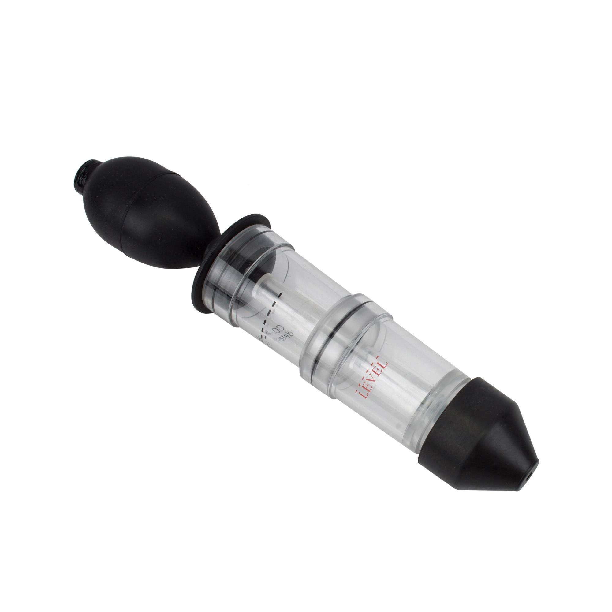 Hier greift das Funktionsprinzip des Testgerätes: Die beiden Kammern des Lecktesters werden mit Kontrastmittel befüllt und die Luft aus dem Kühlerausgleichsbehälter mithilfe des Blasebalgs durch den Tester gezogen.