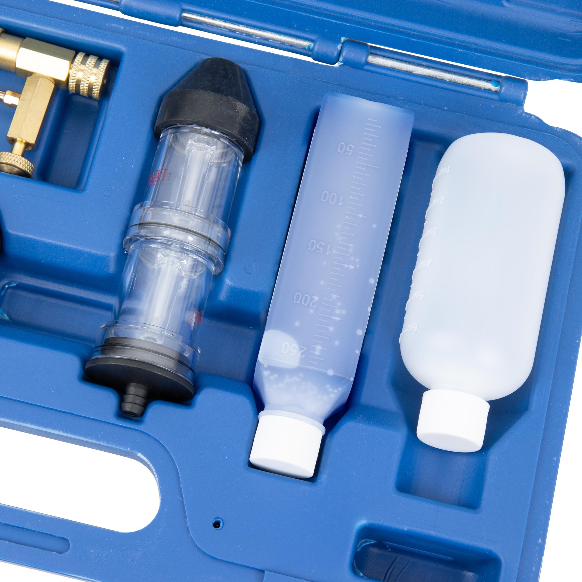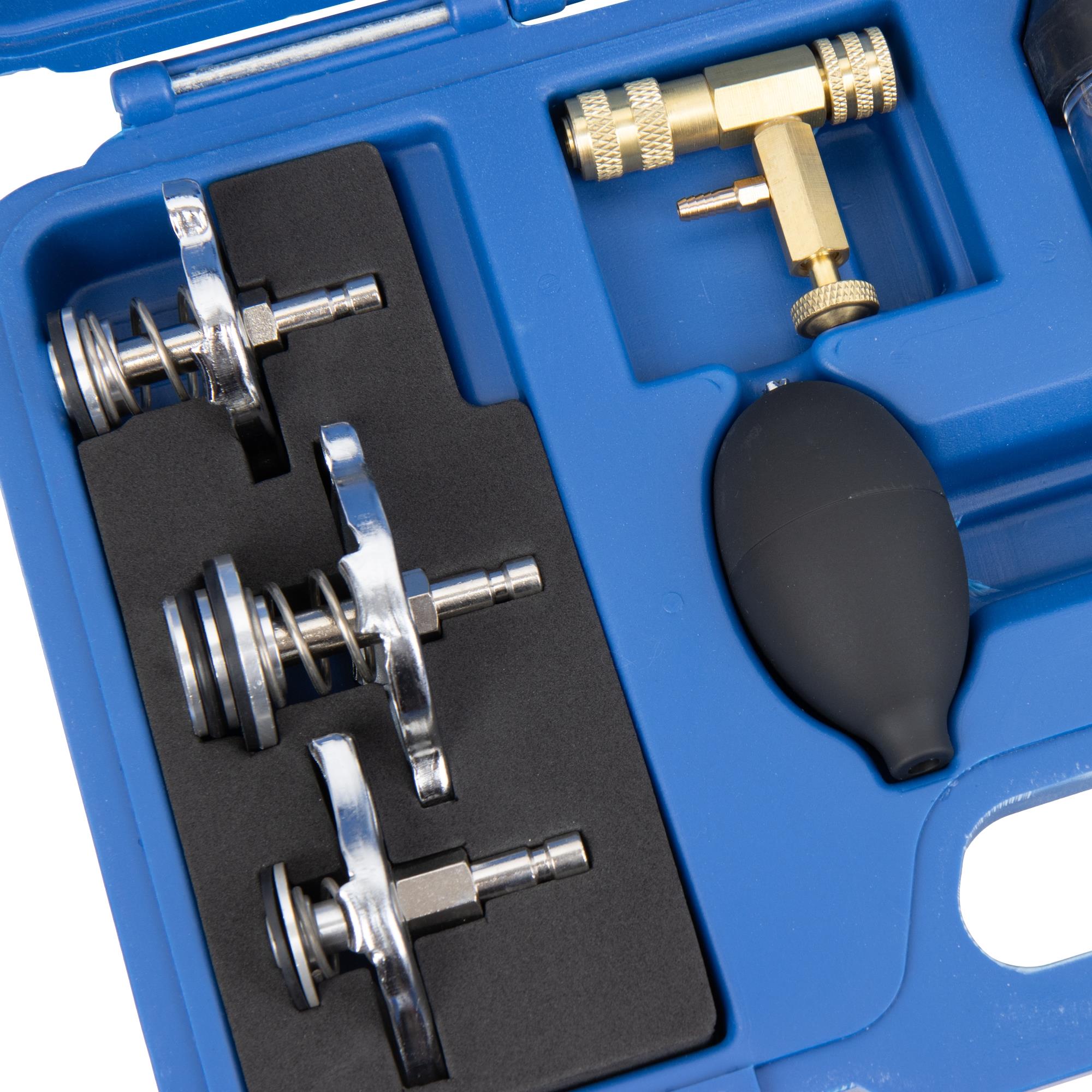 Test- und Prüfgerät zum Ermitteln undichter Zylinderkopfdichtungen, inkl. 250 ml blauer Kontrastflüssigkeit.