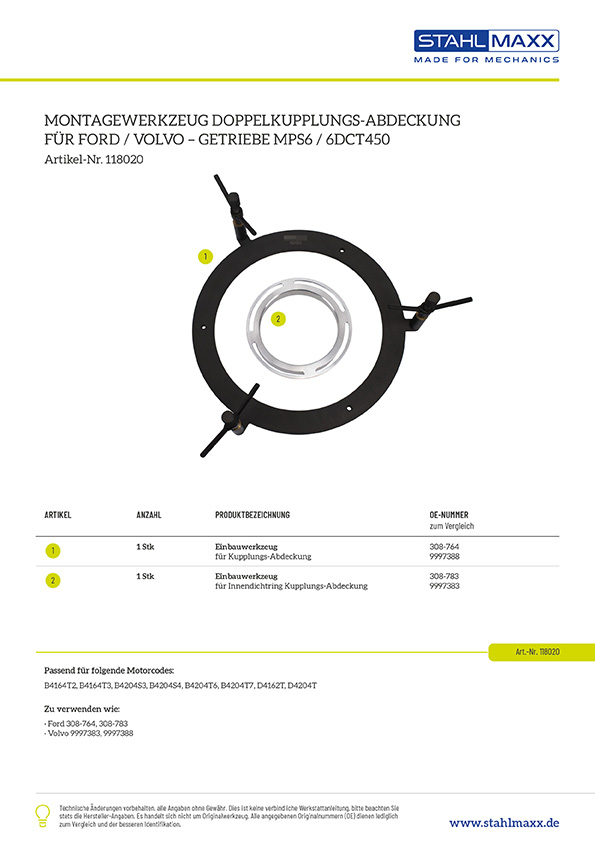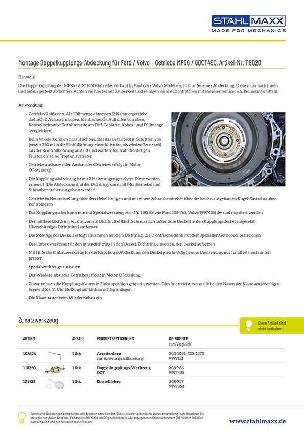 Weiterführende Links zu "Montagewerkzeug Doppelkupplungs-Abdeckung, für Ford, Volvo Getriebe MPS6 / 6DCT450"