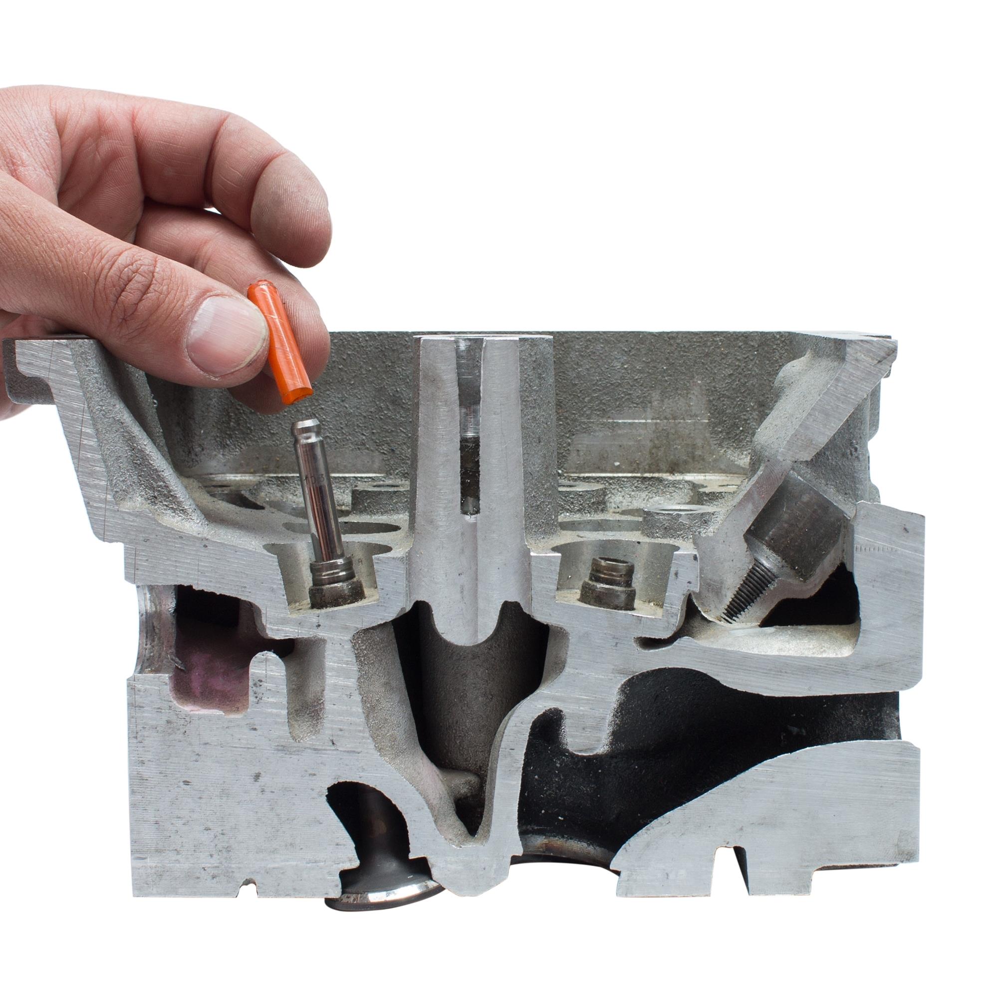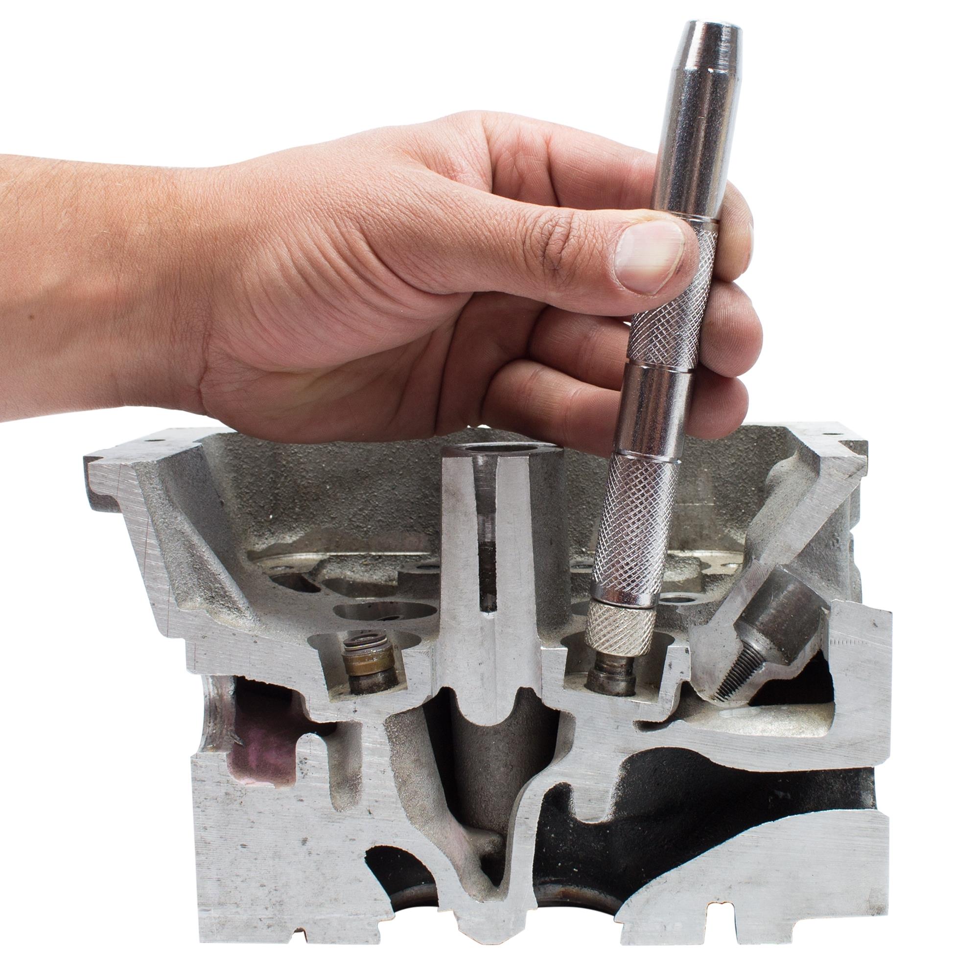 Dieser Spezialwerkzeugsatz erleichtert den beschädigungsfreien Tausch der Ventilschaftdichtungen und ist auch zum Eintreiben bzw. Eindrücken von Ventilschaftführungen in den Zylinderkopf geeignet.