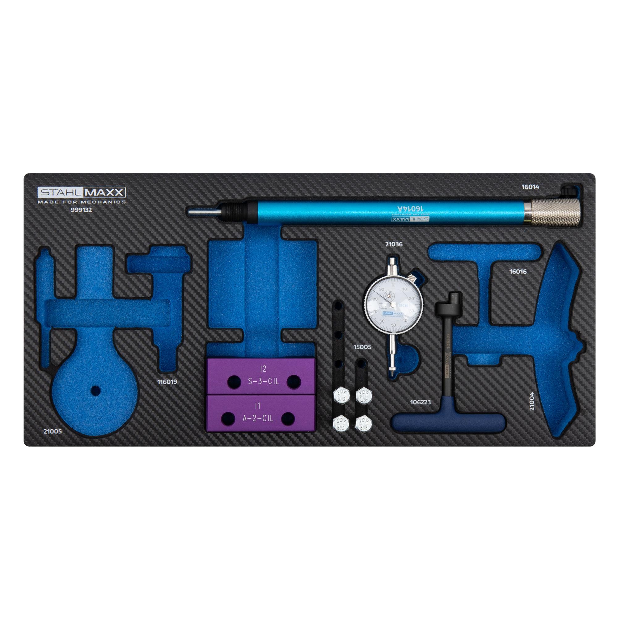 Dieses Werkzeug benötigen Sie für Arbeiten im Bereich der Motorsteuerung sowie für die Prüfung und Einstellung der Steuerzeiten bei den unten aufgeführten Alfa-Motoren. Mithilfe von Messuhr und Messuhrhalter kann der OT korrekt ermittelt werden. Das Fixieren der Nockenwellenposition ist mittels Arretierblöcken möglich. Der professionelle Spezialwerkzeugsatz wird in einem robusten Koffer mit einer abwischbaren Schaumstoffeinlage in Carbon-Optik geliefert. Die Schaumstoffeinlage ist ebenfalls für alle gängigen Werkstattwagen geeignet.