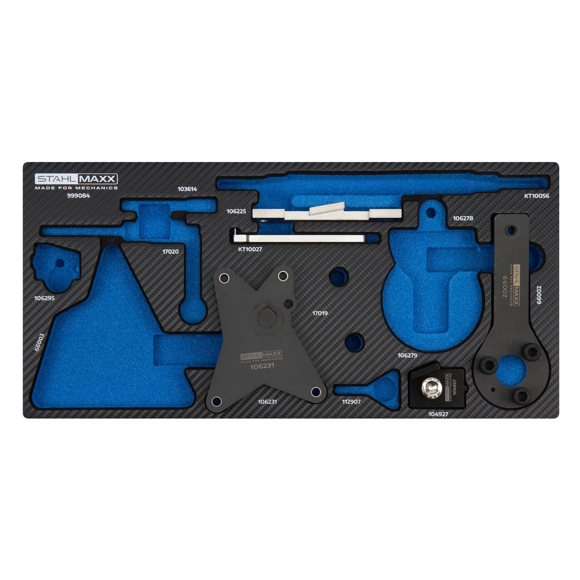 Diesen Werkzeugsatz benötigen Sie für die Instandsetzungsarbeiten im Bereich der Motorensteuerung bei den unten aufgeführten Motoren von Alfa, Fiat und Ford. Das Spezialwerkzeug wird in einem robusten Koffer mit einer abwischbaren Schaumstoffeinlage in Carbon-Optik geliefert, die auch in gängige Werkstattwagen einsetzbar ist. Der Satz enthält Werkzeug zur Nockenwellenarretierung, Kurbelwellenarretierung etc.