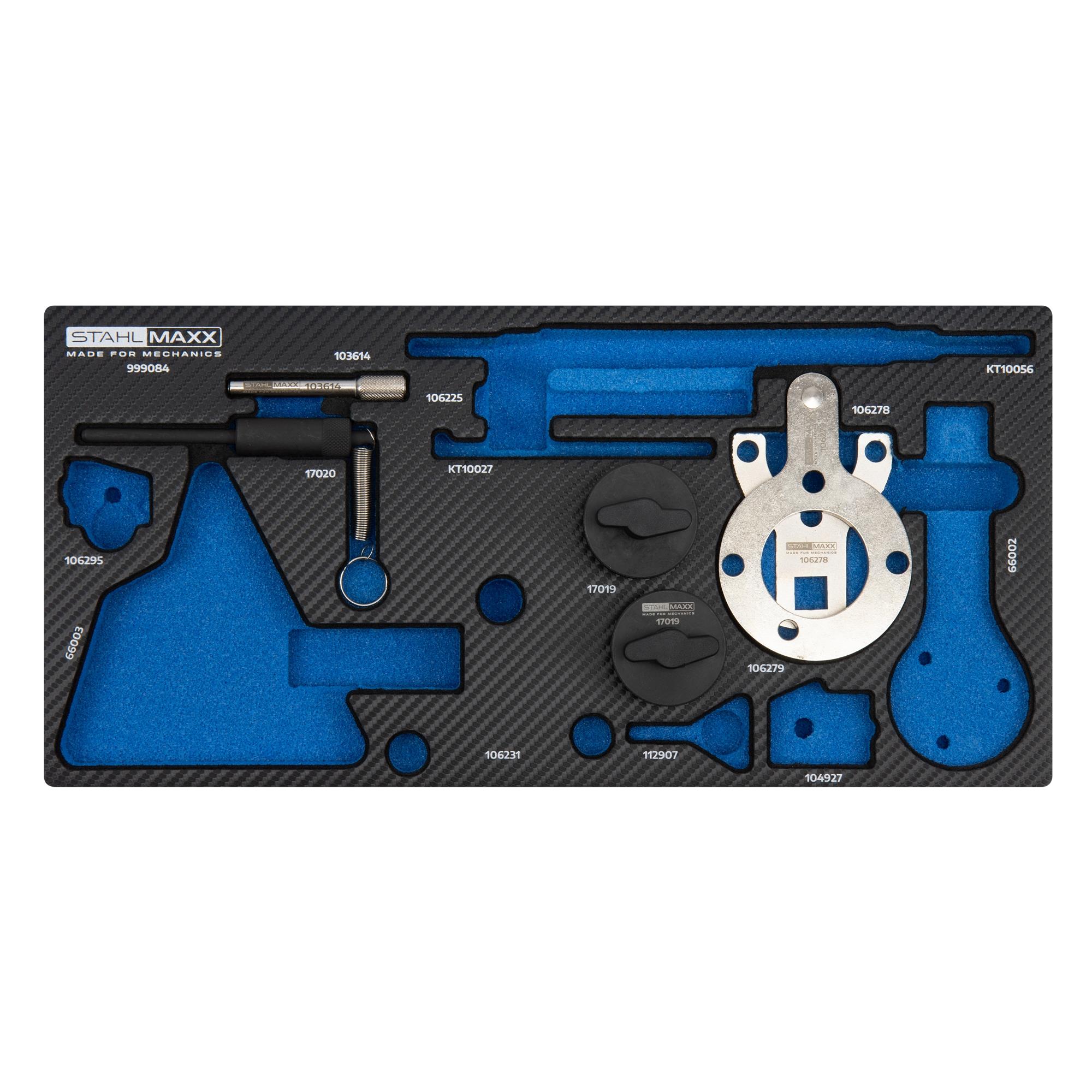Dieses professionelle Werkzeug verwenden Sie für Arbeiten im Bereich der Motorensteuerung / Motoreninstandsetzung bei den unten aufgeführten Motoren von Fiat, Lancia, Opel, Alfa, Suzuki, Peugeot und Citroen. Das Spezialwerkzeug wird durch einen stabilen Koffer geschützt und mit einer robusten Schaumstoffeinlage in Carbon-Optik geliefert, welche außerdem passgenau für gängige Werkstattwagen ist. Der Werkzeugsatz dient zum Arretieren der Nockenwelle, Fixieren der Kurbelwelle, Vorspannen der Spannrolle etc.