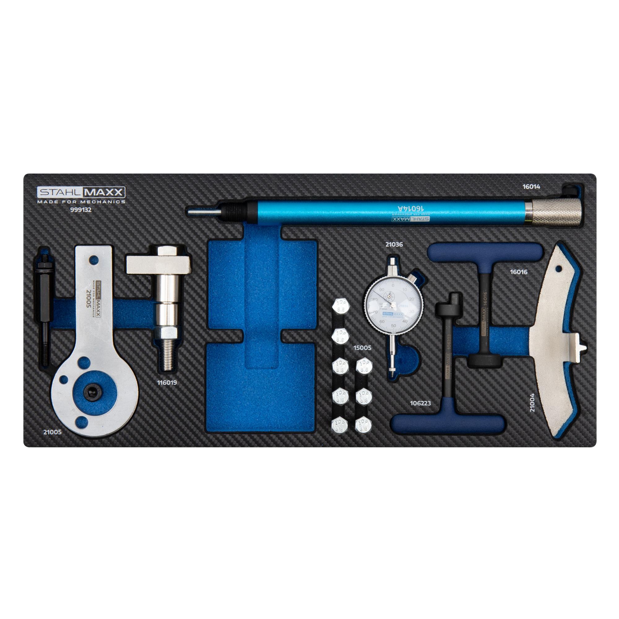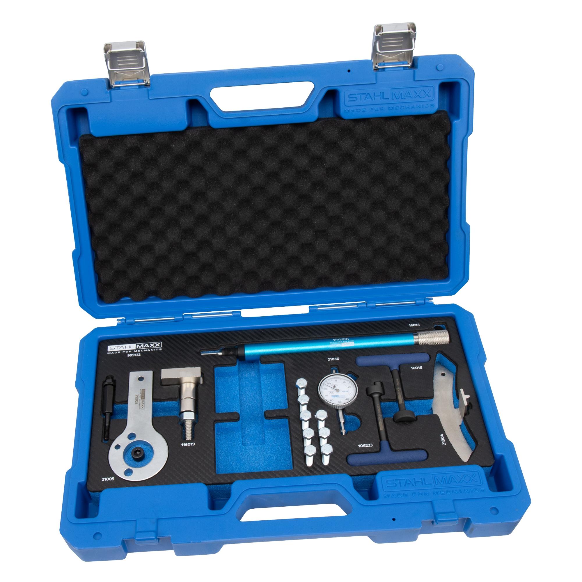 Professionelles Werkzeug für die Prüfung und Einstellung der Steuerzeiten z. B. beim Zahnriemenwechsel oder anderen Arbeiten im Bereich der Motorsteuerung, die eine Montage / Demontage des Zahnriemens voraussetzen. Zur korrekten Ermittelung des OT beim Motor mithilfe von Messuhr und Messuhrhalter. Das Fixieren der Nockenwellenposition ist mittels Arretierblöcken (nicht im Grundsatz enthalten) möglich. Das Spezialwerkzeug wird mit einem robusten Werkzeugkoffer und einer hochwertigen Schaumstoffeinlage in Carbon-Optik geliefert, die außerdem passgenau für alle gängigen Werkstattwagen ist.
