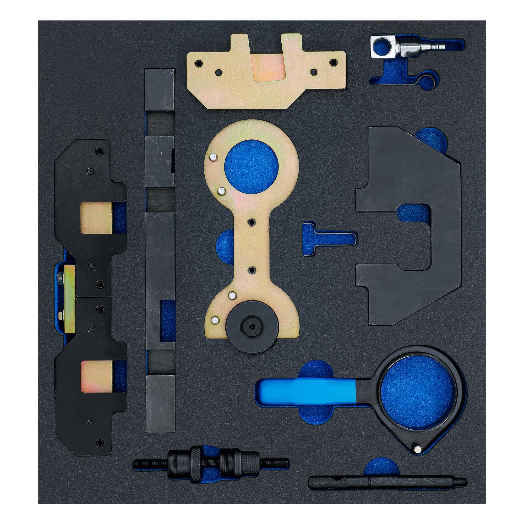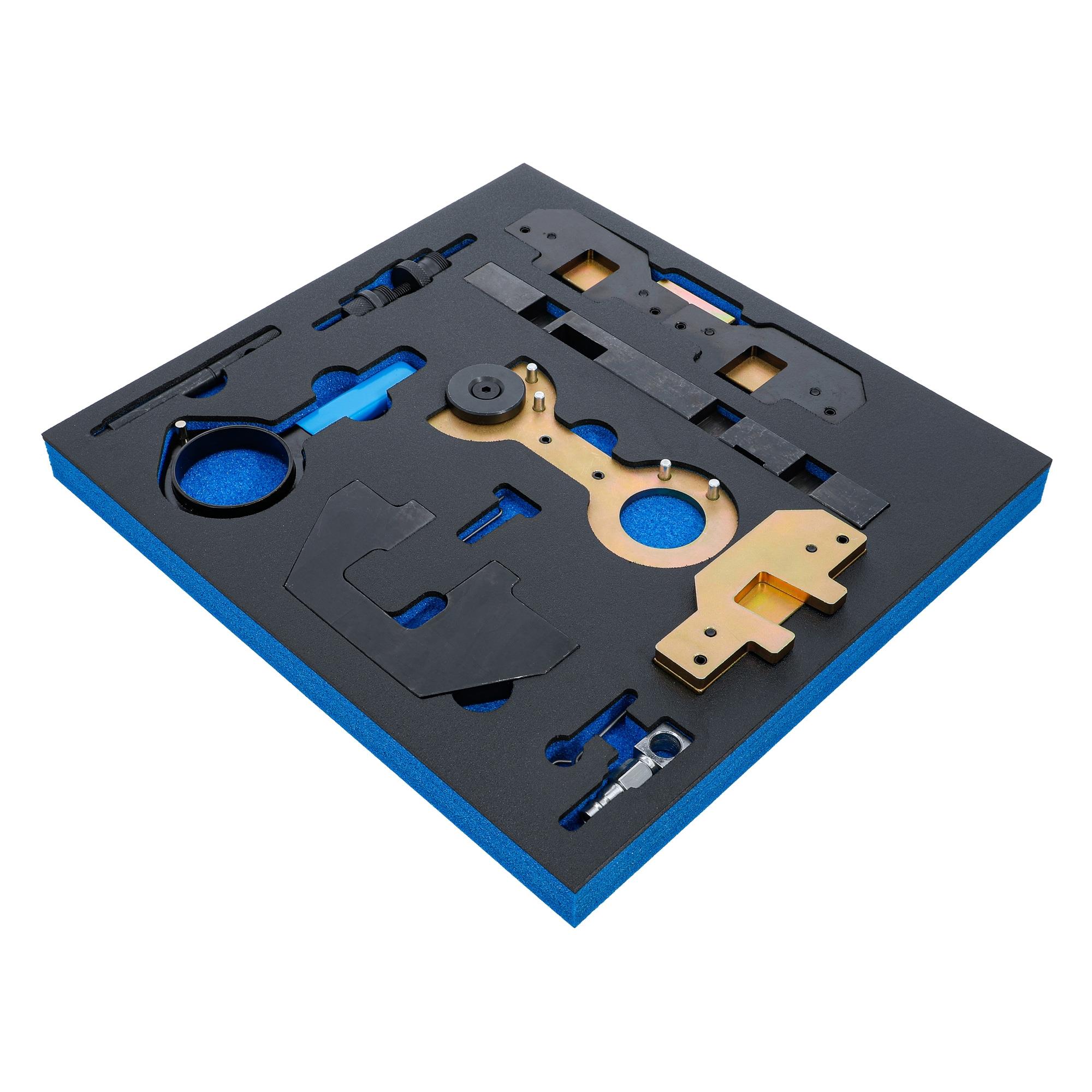 In diesem Set sind Einstell- und Blockierwerkzeuge für Nockenwellen, Kurbelwellen, der Vanos-Einheiten und zur Steuerkettenvorspannung enthalten.