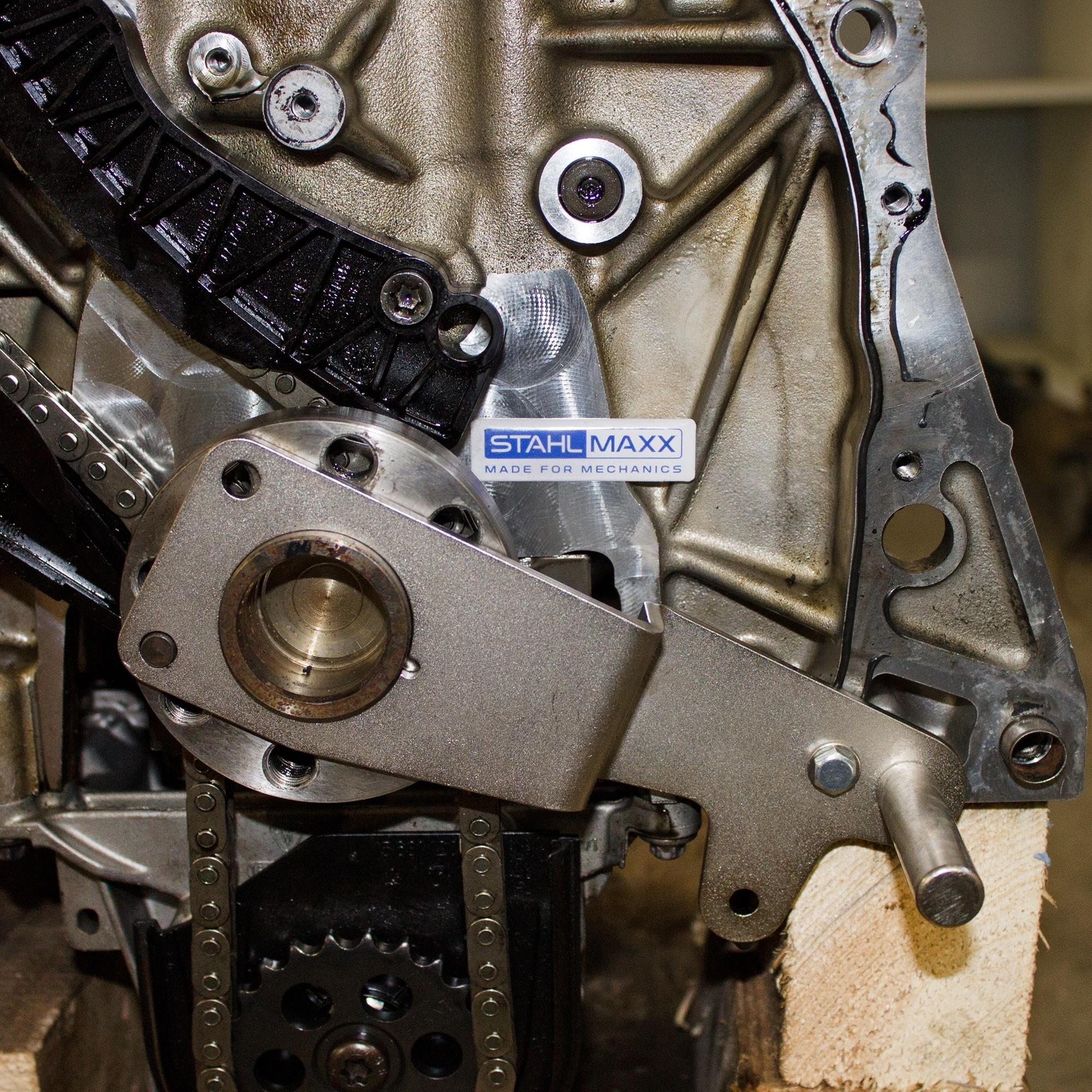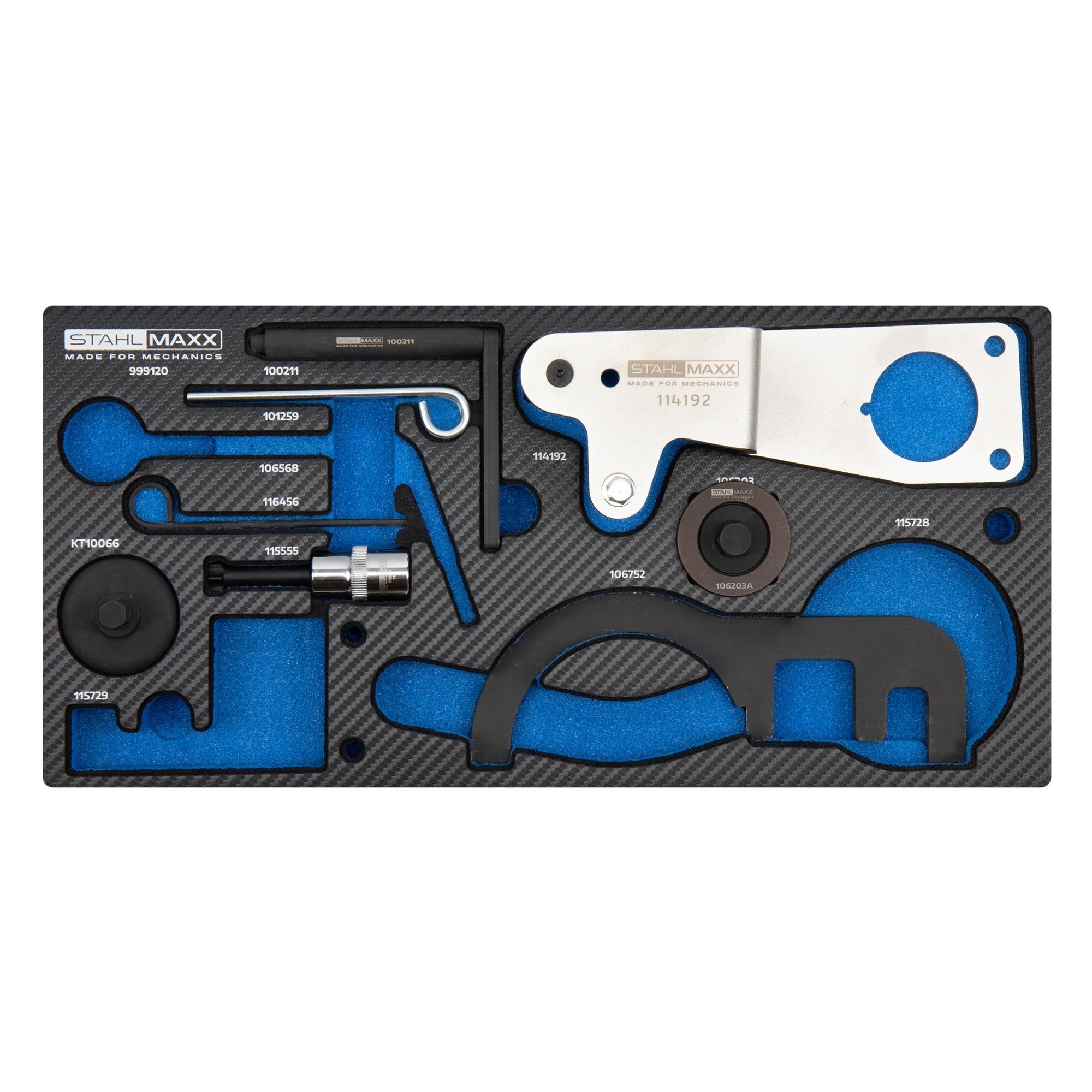 Dieses Werkzeug benötigen Sie für Instandsetzungsarbeiten im Bereich der Motorsteuerung bei den unten aufgeführten BMW-Motoren. Der professionelle Spezialwerkzeugsatz wird in einem robusten Koffer mit einer Schaumstoffeinlage in Carbon-Optik geliefert, die ebenfalls für gängige Werkstattwagen geeignet ist. Dieser enthält Werkzeuge zur Nockenwellenarretierung, Kurbelwellenarretierung etc.
