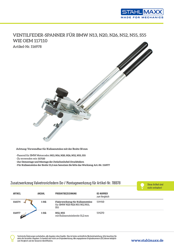 Vergleichsnummern zu "Ventilfeder-Spanner, 58 mm, für BMW N13, N20, N26, N52, N55, S55, wie OEM 117110"