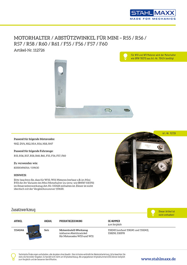HINWEIS: Bitte beachten Sie, dass für W10, W11 Motoren (verbaut z.B. im Mini R50) die 2te Variante des Mini-Motorhalter (zu verw. wie BMW 118370) nötig ist. Diesen finden Sie unter Art.-Nr. 120460 oder im Steuerzeiten-Satz Art.-Nr. 115424. Dieser ist nicht identisch mit der Vergleichsnummer 119630.