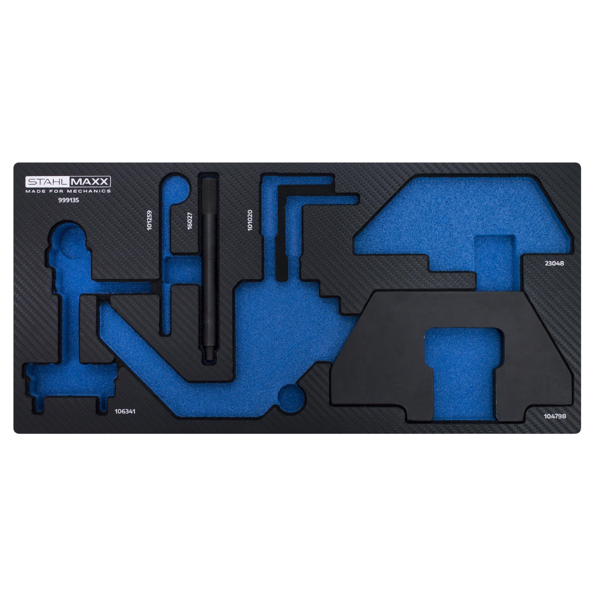 Für Instandsetzungsarbeiten im Bereich der Motorsteuerung bei den unten aufgeführten BMW-Motoren. Der Werkzeugsatz wird durch einen stabilen Koffer und eine Schaumstoffeinlage in Carbon-Optik geschützt. Durch die abwischbare Oberfläche ist die Schaumstoffeinlage sehr widerstandsfähig. Der Werkzeugsatz beinhaltet professionelles Spezialwerkzeug zum Vorspannen der Spannrolle, Arretieren der Nockenwelle, Fixieren der Kurbelwelle etc. und kann ebenfalls in alle gängigen Werkstattwagen eingesetzt werden.