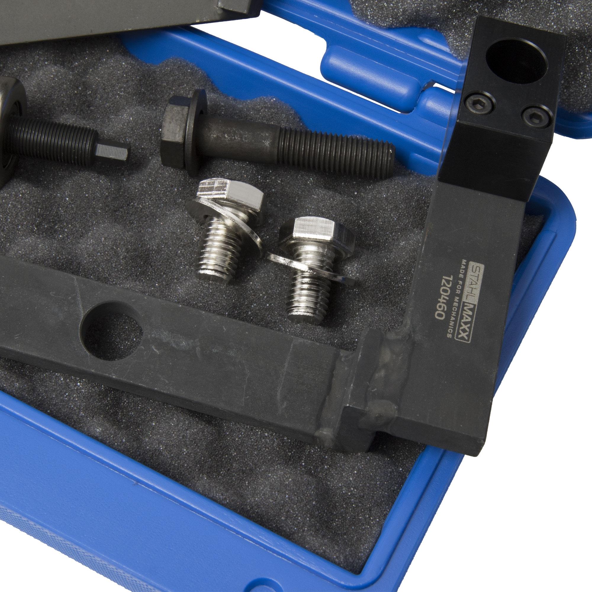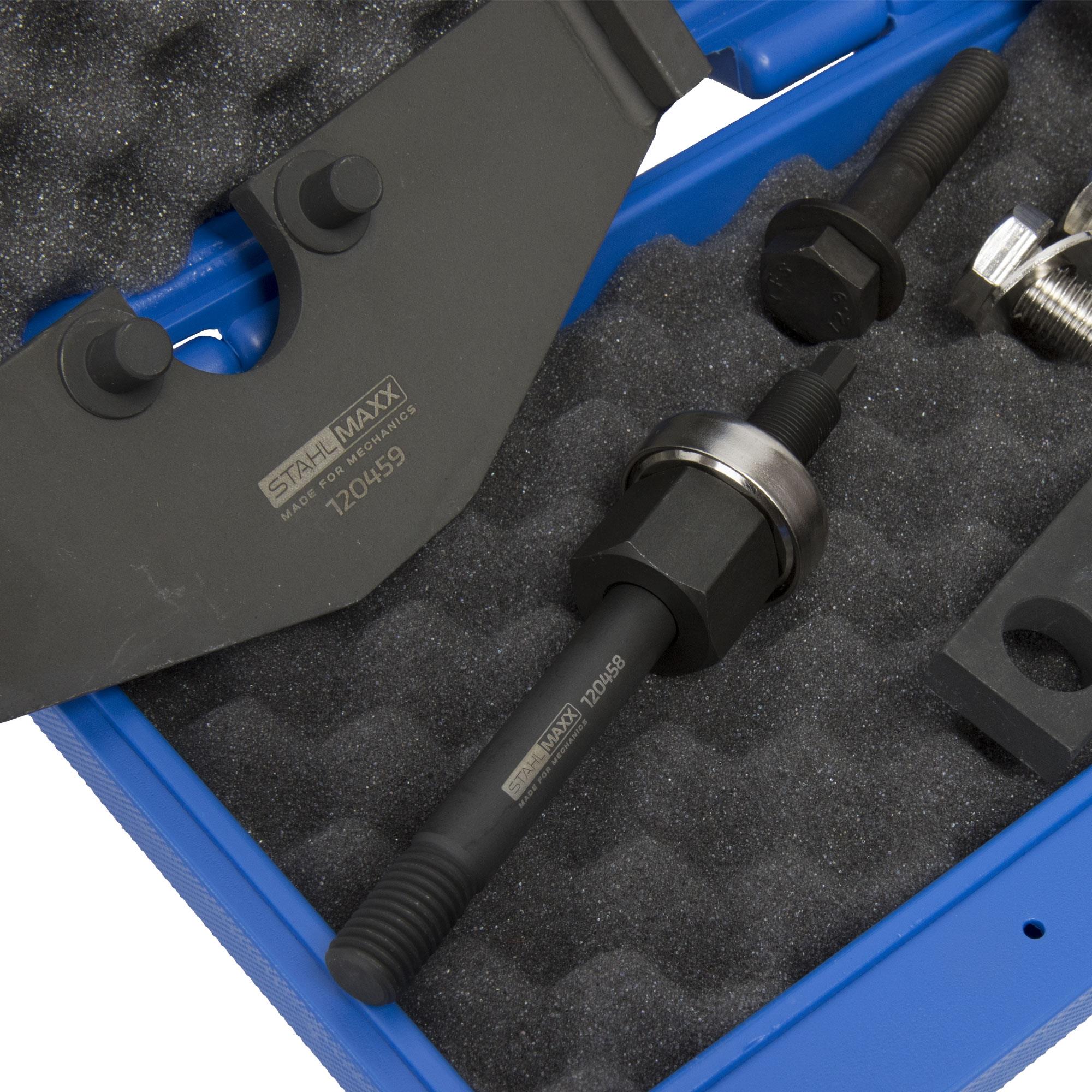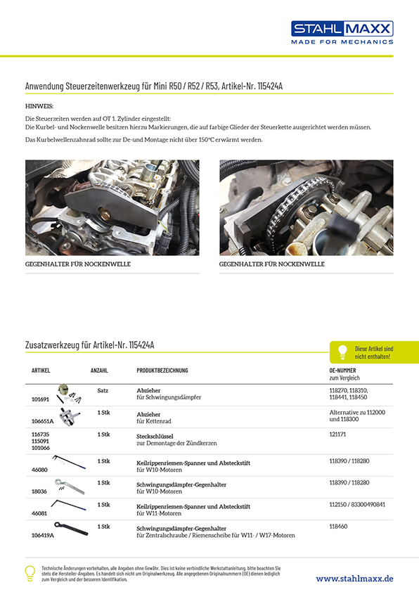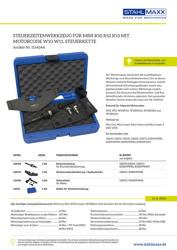 Das Spezialwerkzeug zum Einstellen der Steuerzeiten an der Motorenreihe W10 und W11, verbaut in Mini R50, R52 und R53, beinhaltet zum Steuerkettenwechsel alle unabdingbaren Werkzeuge. Der an diesen Motoren verbaute Keilrippenriemenspanner und der oft festsitzende Schwingungsdämpfer macht aber gegebenenfalls noch weitere Werkzeuge empfehlenswert. Ein Erneuern des Nockenwellen- und Kurbelwellenrades ist ebenso angeraten. Den passenden Abzieher hierfür finden Sie unter Art.-Nr. 106551A.
