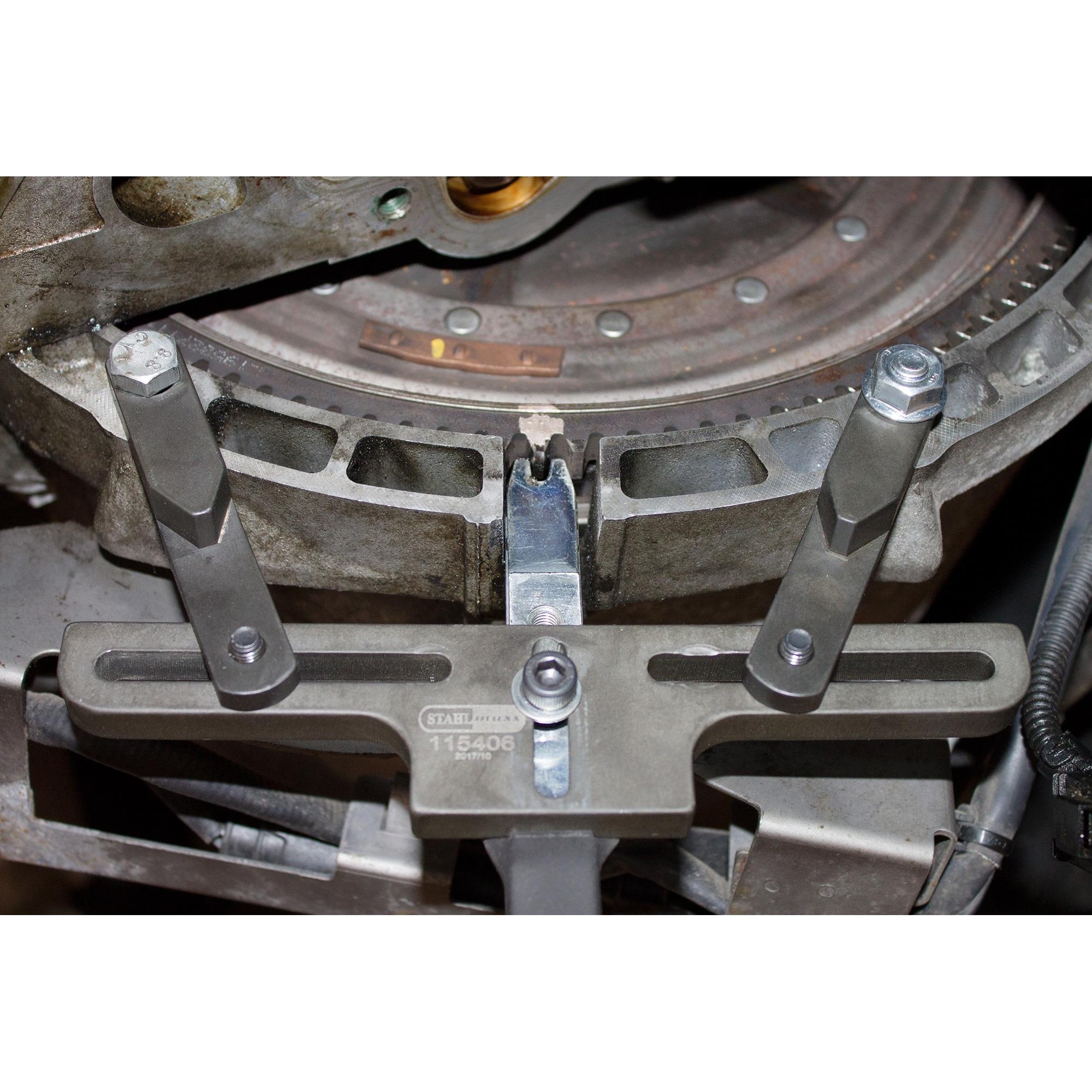 Dieses Spezialwerkzeug, zur Blockierung der Kurbelwelle bei vielen BMW Motorenreihen, wird z.b. beim Erneuern des Schwingungsdämpfers, beim Steuerkettentausch oder Erneuern des Kurbelwellendichtrings verwendet, um die zum Teil sehr hohen Drehmomente halten zu können.