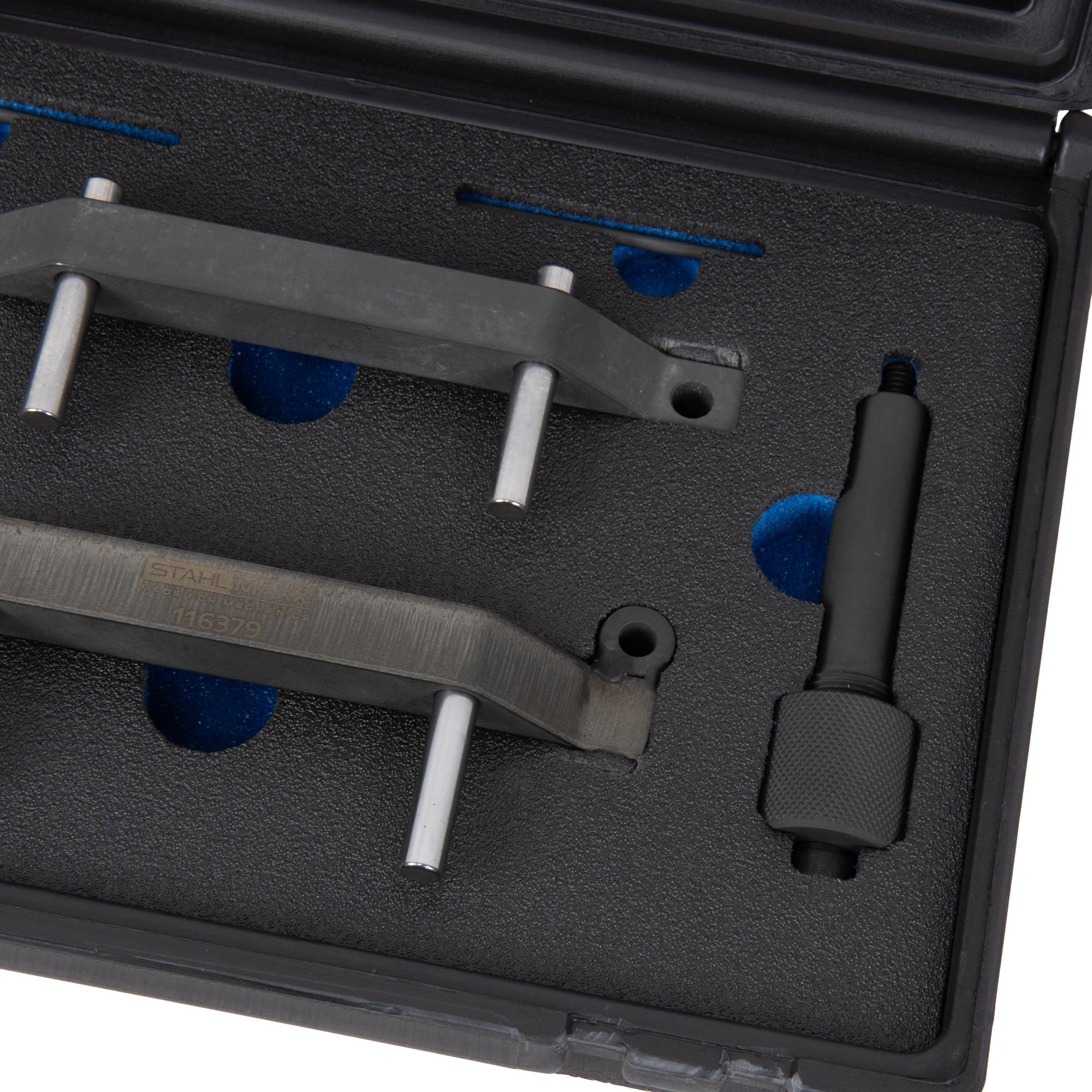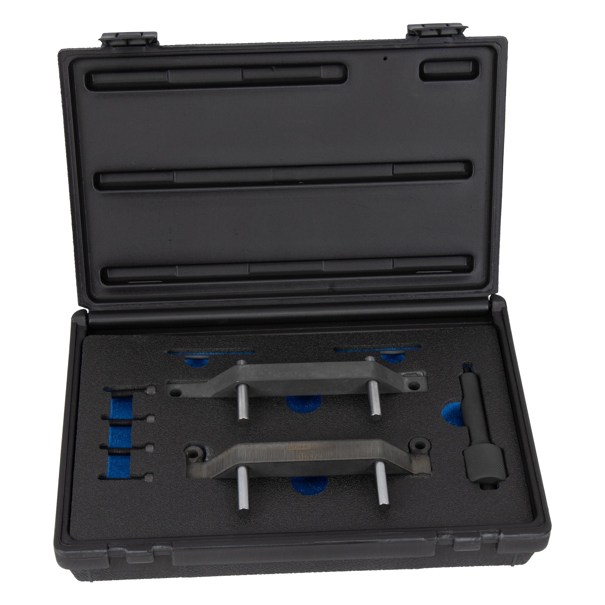 Das Set enthält alle Arretierungswerkzeuge für Nocken- und Kurbelwelle, die für einen Tausch der Steuerkette erforderlich sind.