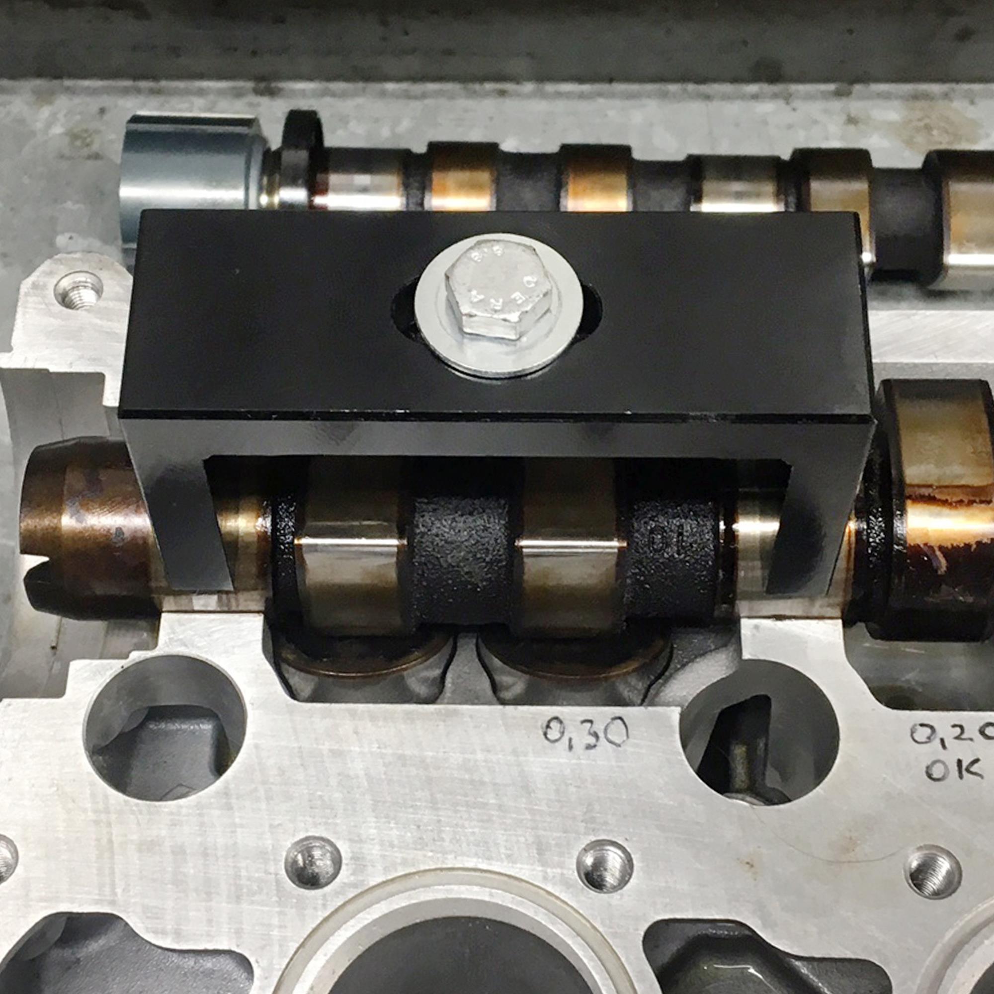 (Prüfposition: Nocken des zu prüfenden Zylinders liegen am silbernen Haltewerkzeug an, Ventil ist nicht betätigt)