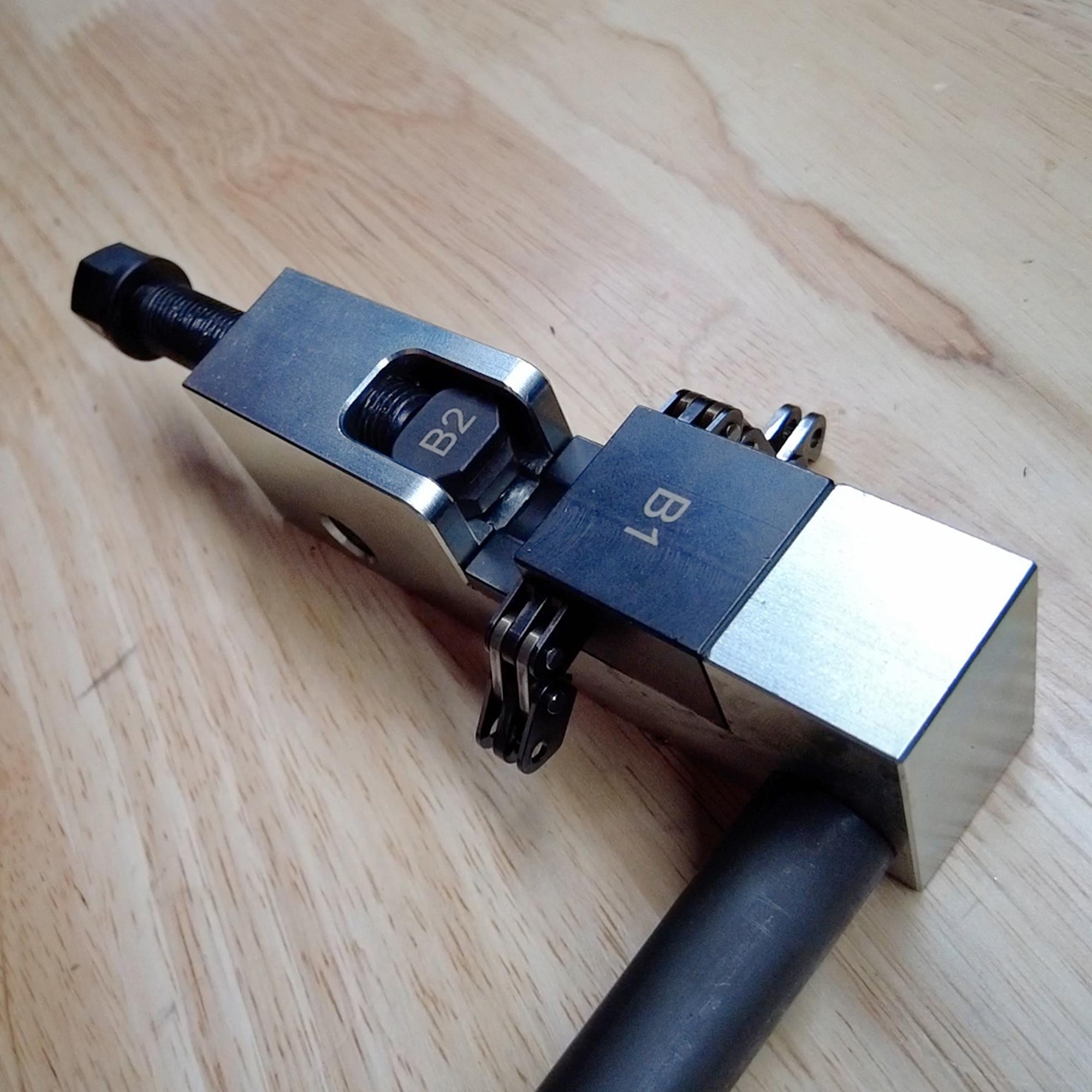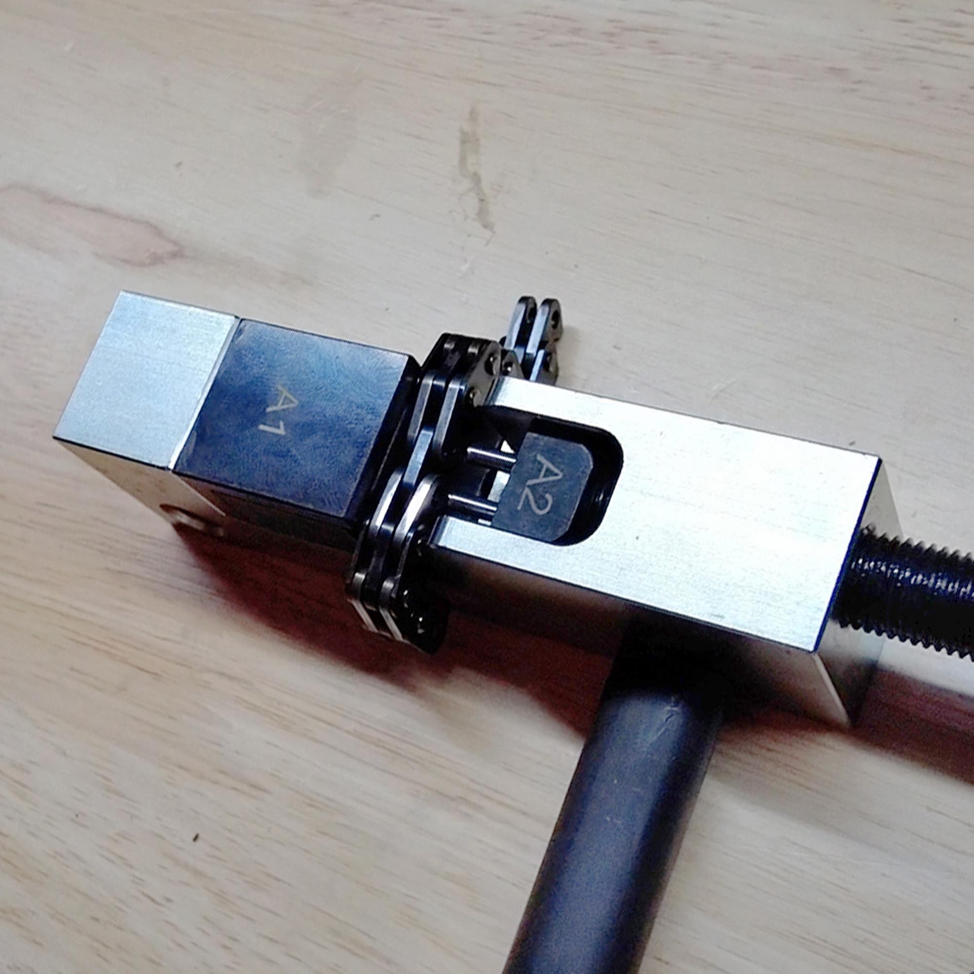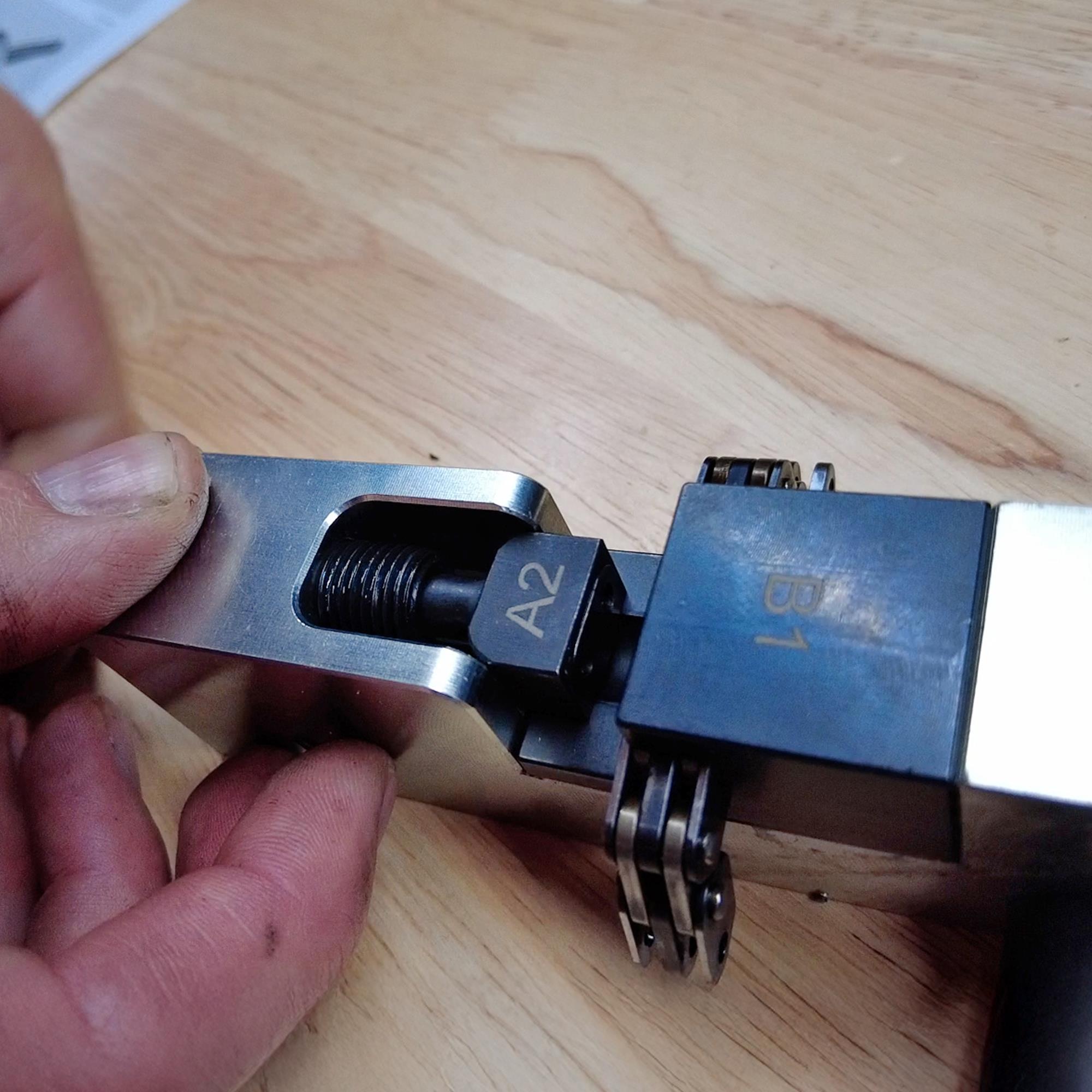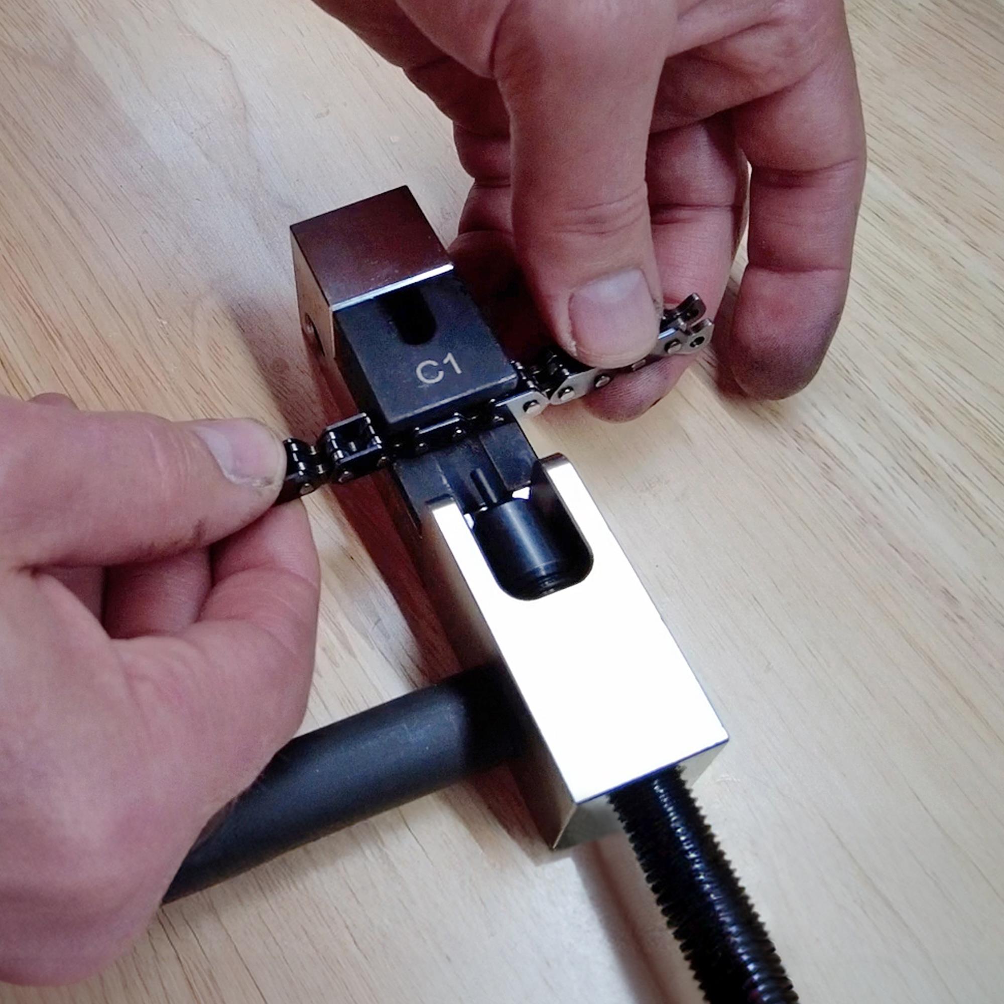 - das neue Kettenschloss einpressen, die neue Kettenlasche aufpressen, die Nietbolzen anschließend vernieten und Vernietung kontrollieren