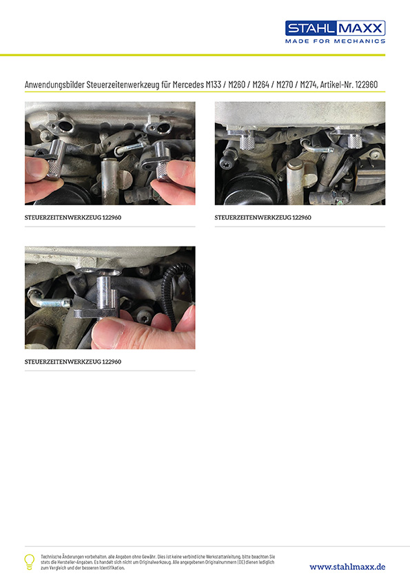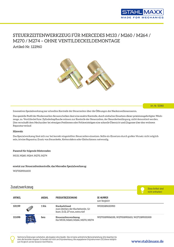 Weiterführende Links zu "Steuerzeiten Werkzeug für Mercedes M133, M260, M264, M270, M274 Motoren, ohne Ventildeckeldemontage"