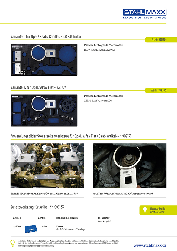 Dieser Satz beinhaltet Spezialwerkzeuge zum Einstellen der Steuerzeiten und zum Aus- und Einbau der Wasserpumpe bei Opel 2,2 16V Benzin-Motoren.