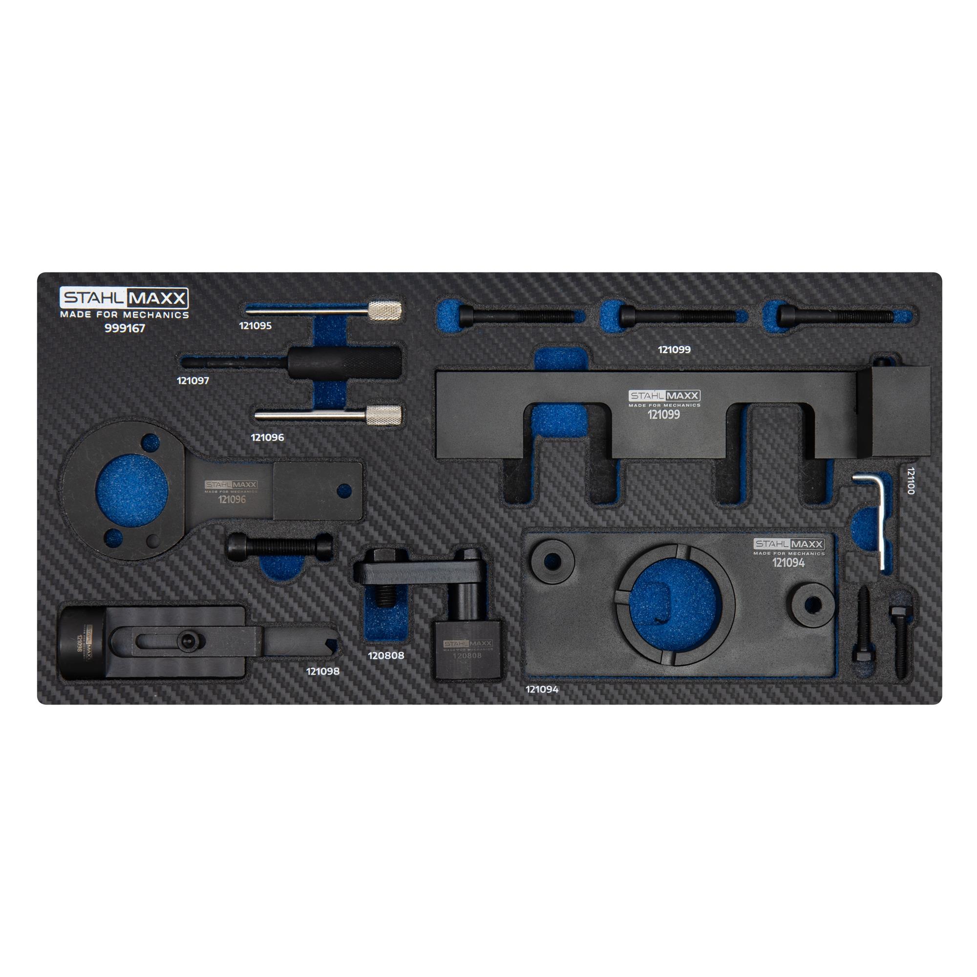 Beide Nockenwellen werden durch eine getriebeseitige Steuerkette synchronisiert. Dieser Spezialwerkzeugsatz eignet sich für einen Zahnriemen-, Steuerketten- und Einspritzpumpenwechsel und enthält hierfür alle Steuerzeiten- und Blockierwerkzeuge. Im Satz enthalten sind die Werkzeuge zur Arretierung der Schwungscheibe bei Fahrzeugen mit Schalt- und Automatikgetriebe.