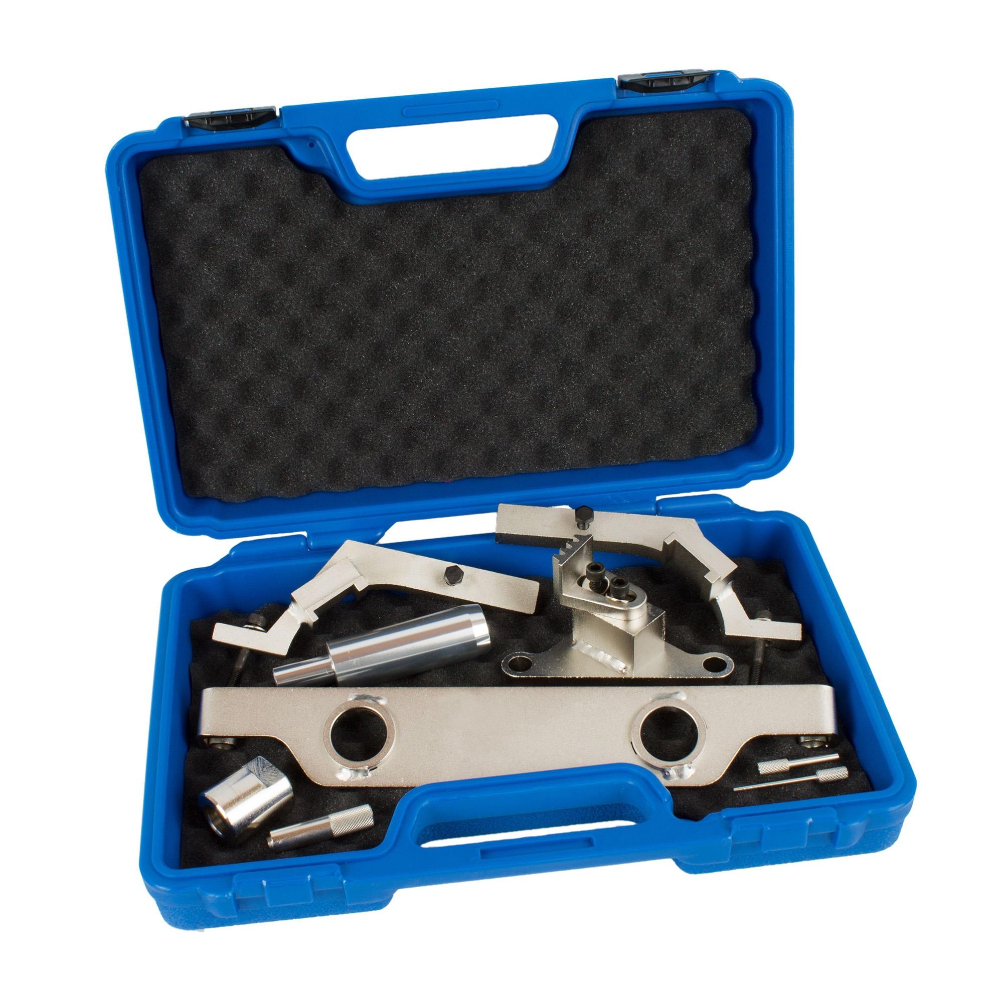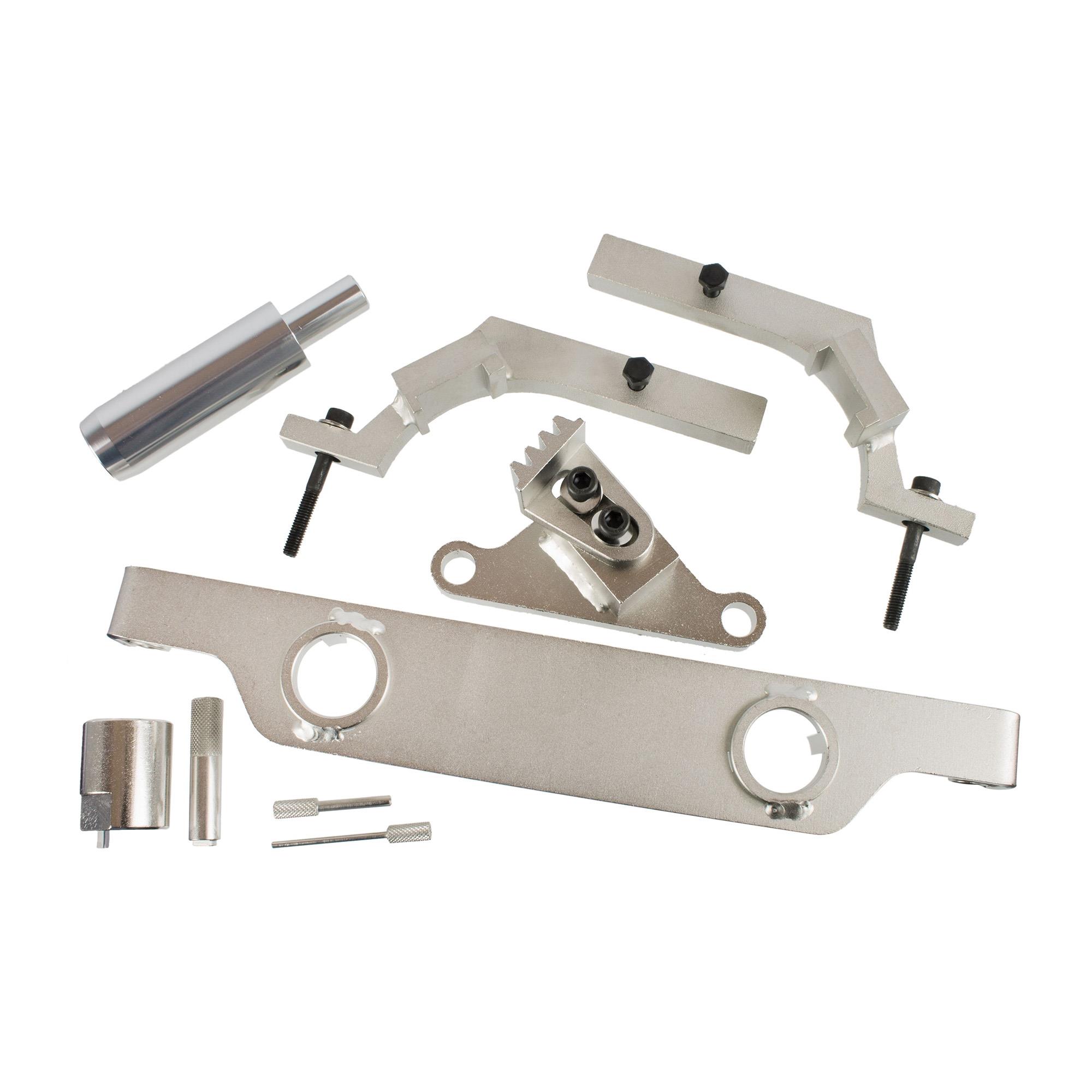 Dieser Satz umfasst alle erforderlichen Elemente, um die Komponenten von Nockenwellen, Kurbelwelle und Kettenspanner einzustellen und zu halten, während größere Arbeiten am Motor oder ein Austausch der Steuerkette und damit verbundenen Teilen vorgenommen werden.