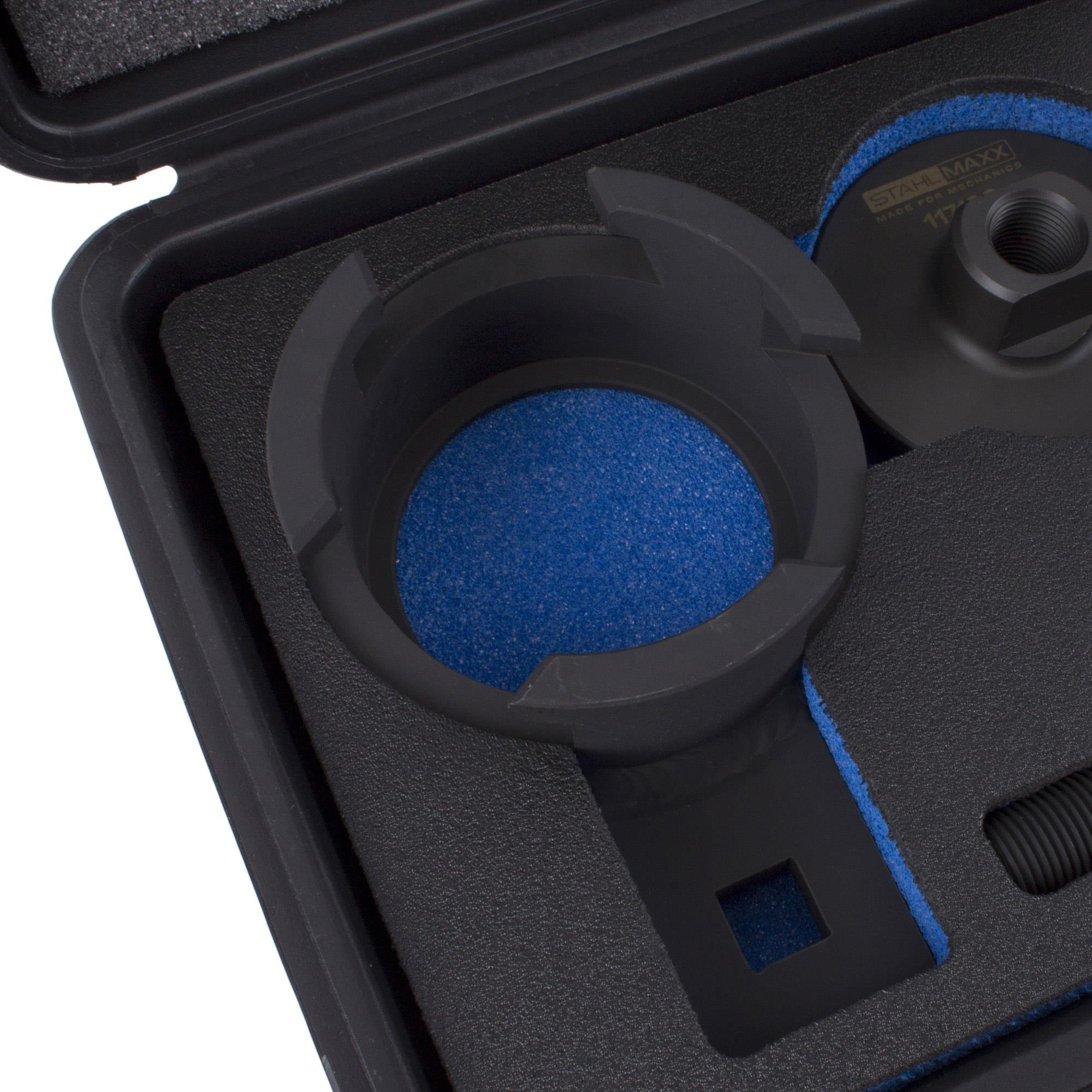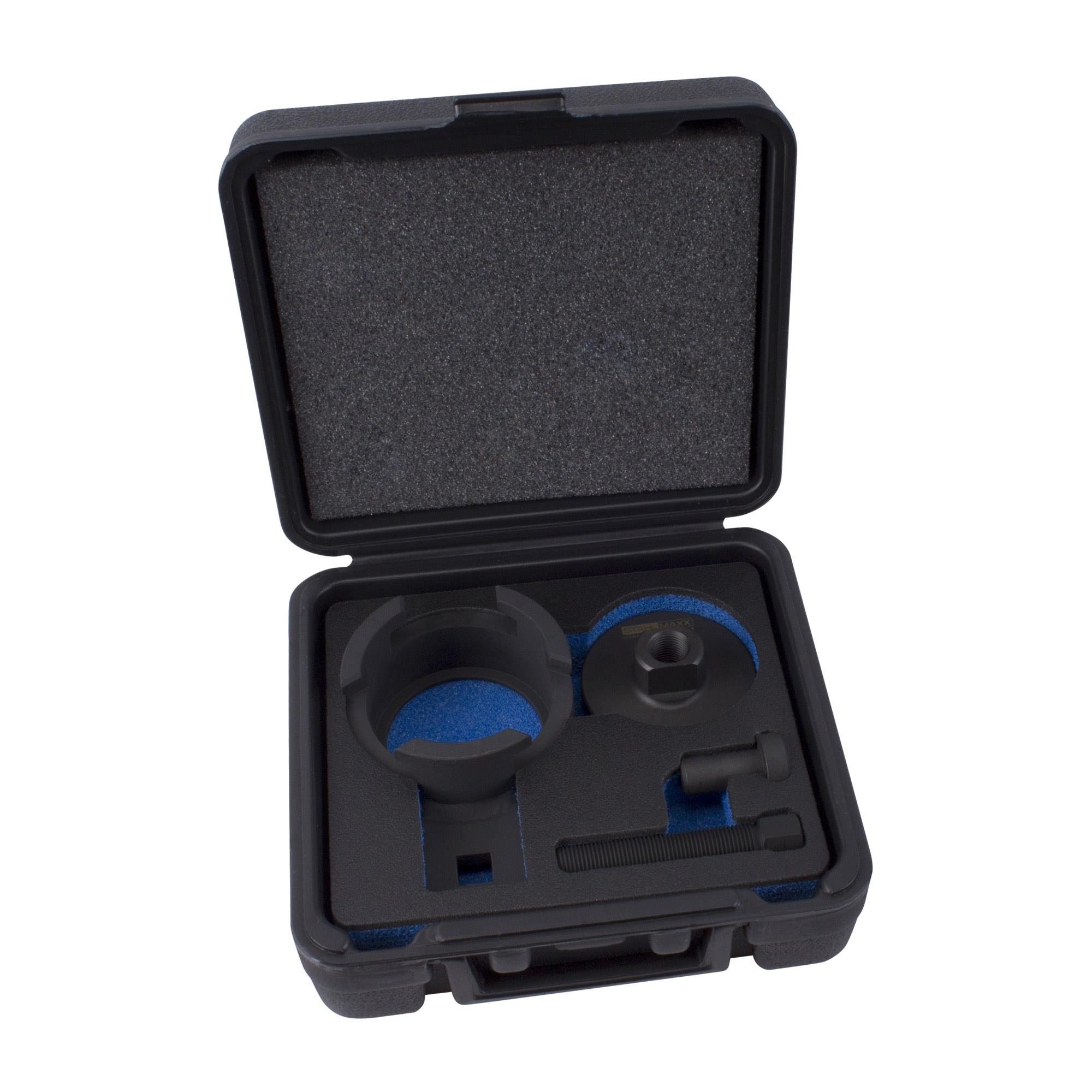 Spezialwerkzeug-Satz zum sicheren Einhaken an der vorderen Kurbelwellenscheibe für Opel (Bj. 2014–2017) 1,0-, 1,4- und 1,5-Liter-Benzinmotoren, damit die Zentralschraube entfernt und die Riemenscheibe anschließend kontrolliert abgezogen werden kann.