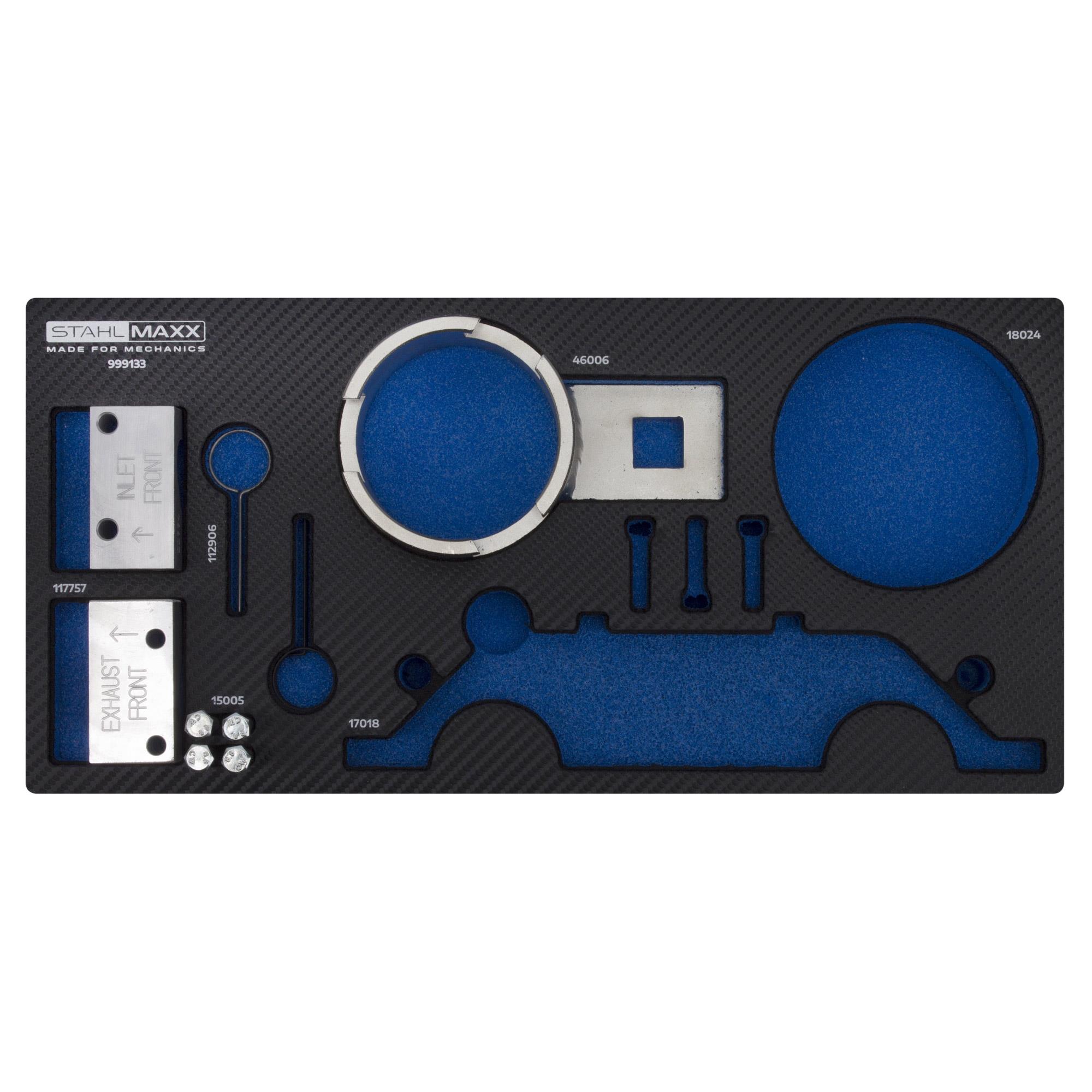 Für Instandsetzungsarbeiten im Bereich der Motorsteuerung bei den unten aufgeführten Motoren von Opel, Saab und Cadillac. Der Werkzeugsatz wird durch einen stabilen Koffer und eine Schaumstoffeinlage in Carbon-Optik geschützt. Dieser beinhaltet professionelles Spezialwerkzeug zum Vorspannen der Spannrolle, Arretieren der Nockenwelle, Fixieren der Kurbelwelle etc. Die Schaumstoffeinlage ist ebenfalls für gängige Werkstattwagen geeignet.