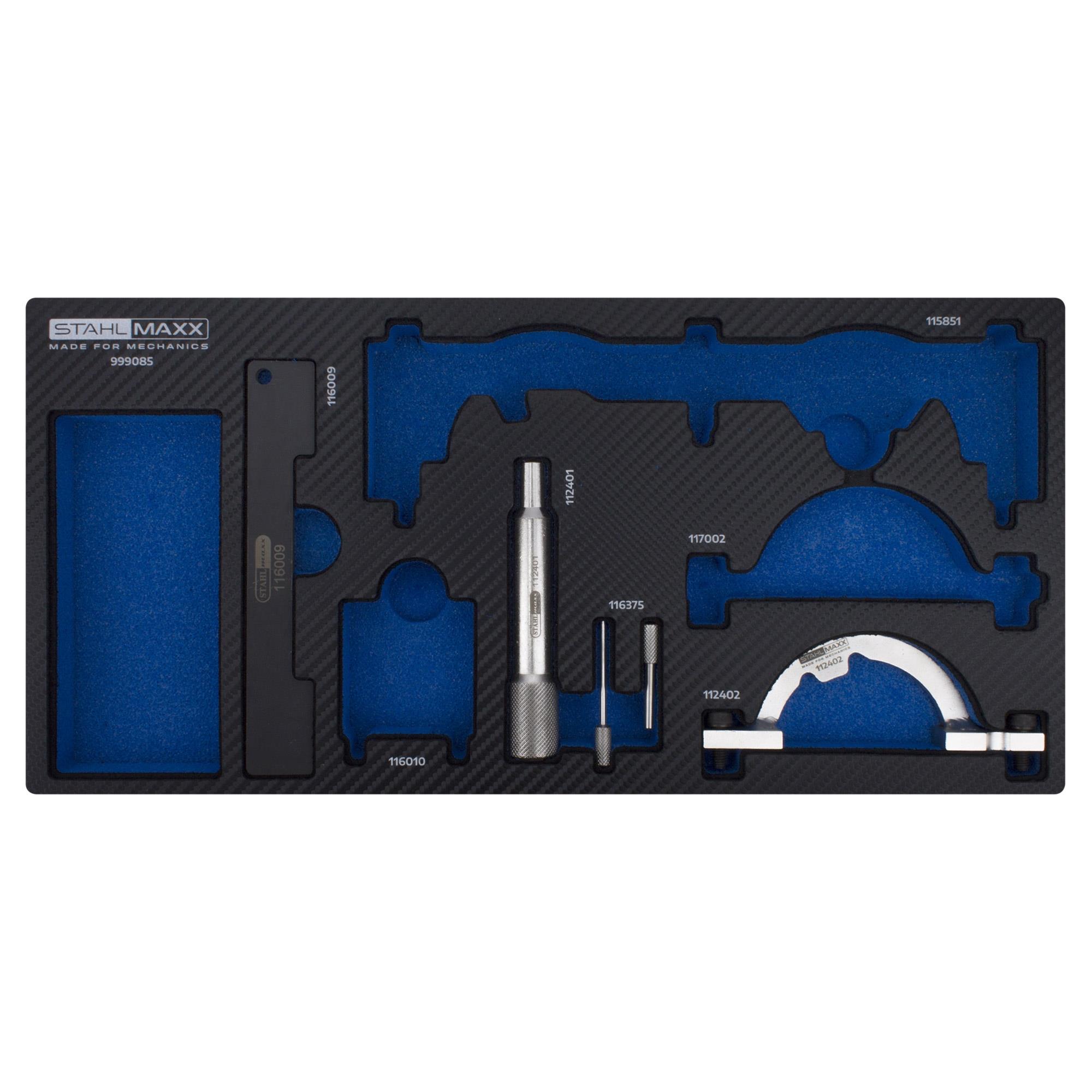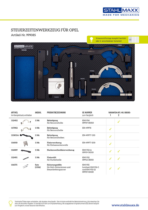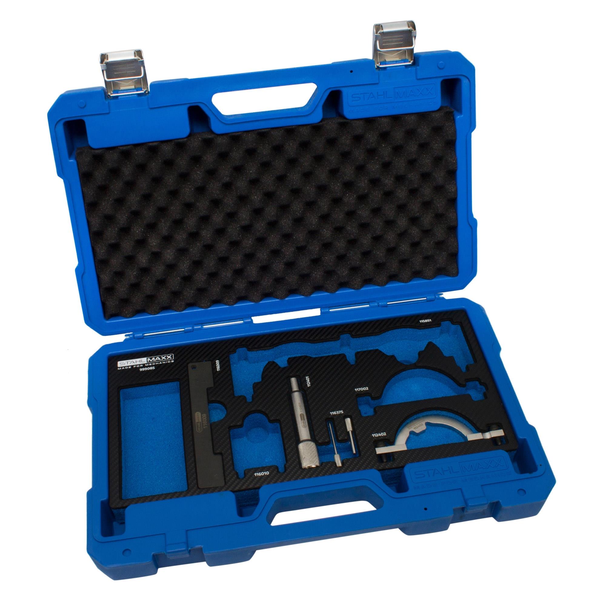 Spezialwerkzeugsatz für die Motoreninstandsetzung/Motorsteuerung bei den unten aufgeführten Opel-Motoren. Dieser beinhaltet Werkzeug zum Arretieren der Nockenwelle, Fixieren der Kurbelwelle, Vorspannen der Spannrolle etc. Zum Schutz der Werkzeuge dient der robuste Koffer und die passgenaue Schaumstoffeinlage. Die Schaumstoffeinlage ist abwischbar und durch ihre Beschichtung besonders stabil. Außerdem können Sie diese auch in Ihrem gängigen Werkstattwagen aufbewahren.