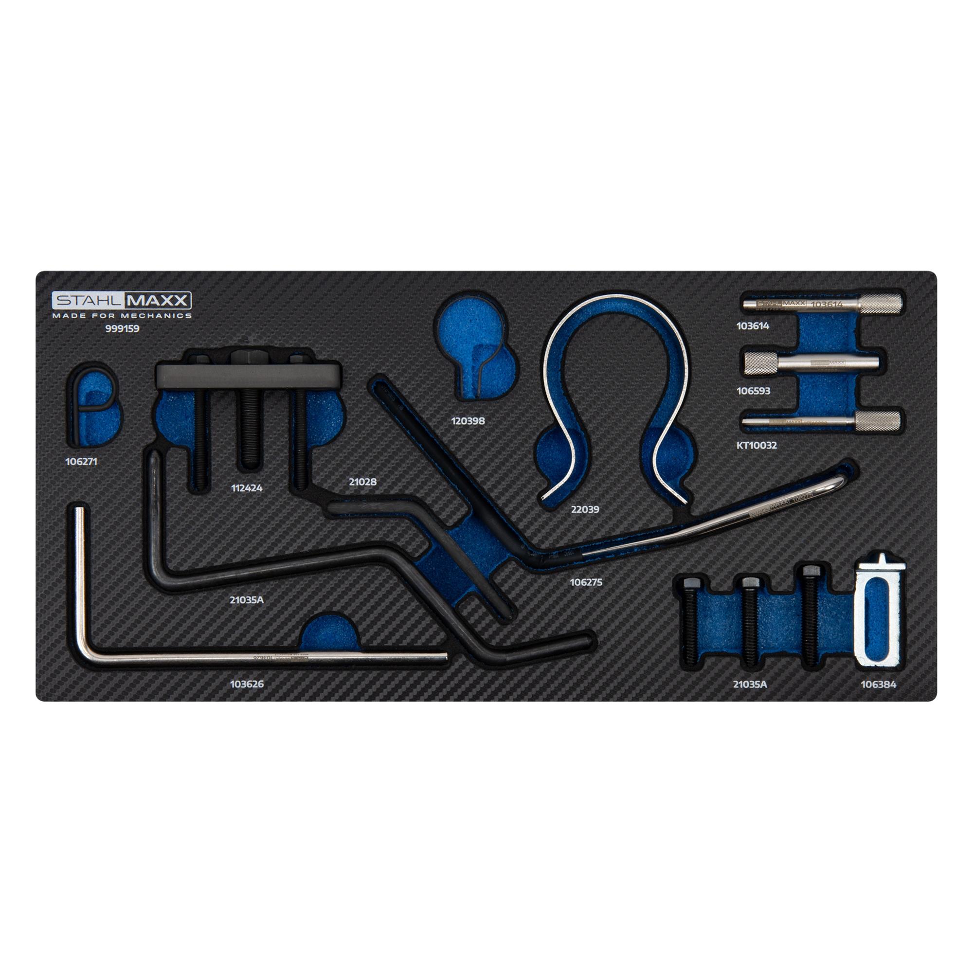 Professioneller Spezialwerkzeugsatz für zahnriemengetriebene 1,4L und 1,6L Benzin Motoren, sowie 2,0L und 2,2L Dieselmotoren von Citroen, Peugeot, Opel, Ford, Mitsubishi, Land Rover, Fiat, Volvo und Toyota, in hochwertiger Schaumstoffeinlage.