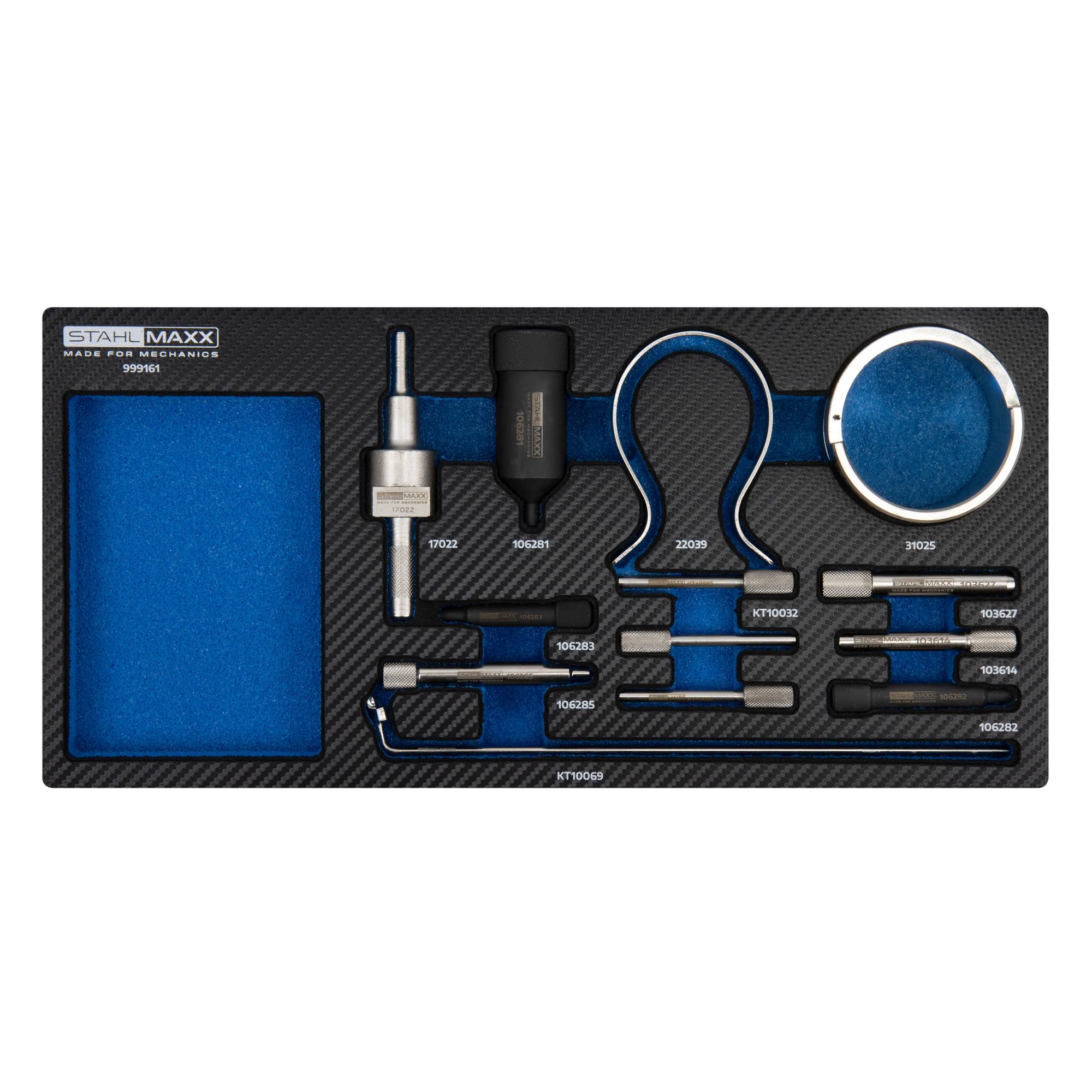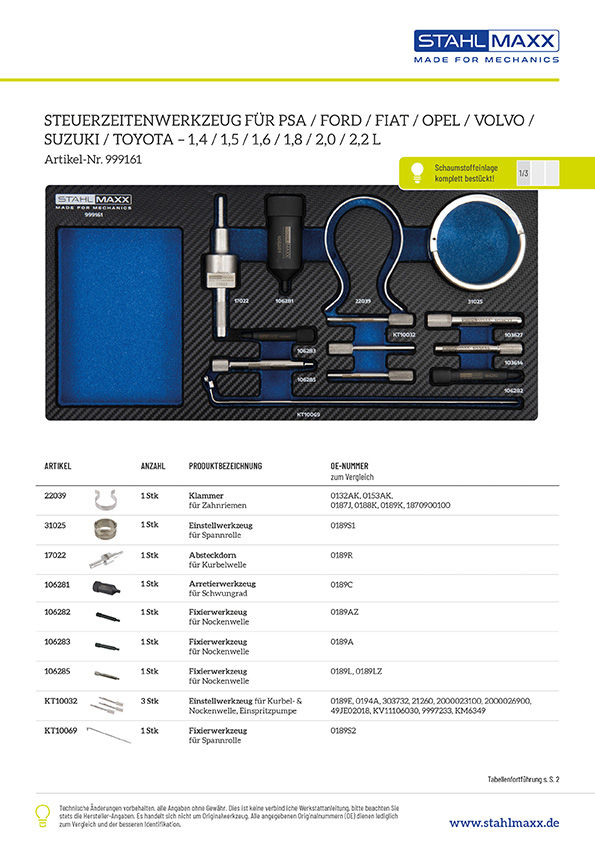 Spezialwerkzeugsatz für den Zahnriemenwechsel und zur Steuerzeiten-Einstellung an vielen Motoren von Citroen, Ford, Fiat, Peugeot, Opel, Suzuki, Volvo und Toyota. Geliefert wird das Spezialwerkzeug in einem robusten Werkstattkoffer mit praktischer Formeinlage.