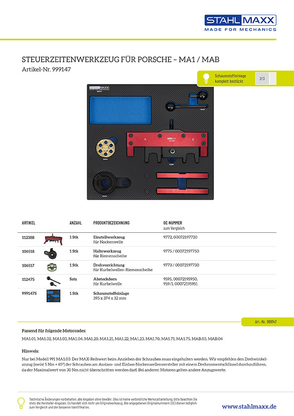 Vergleichsnummern zu "Steuerzeitenwerkzeug-Satz, für Porsche 911, Boxster, Cayman – mit MA1, MAB Motor"