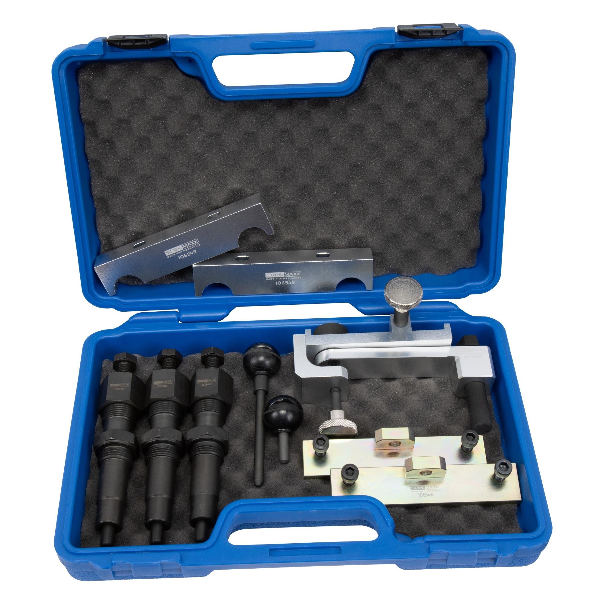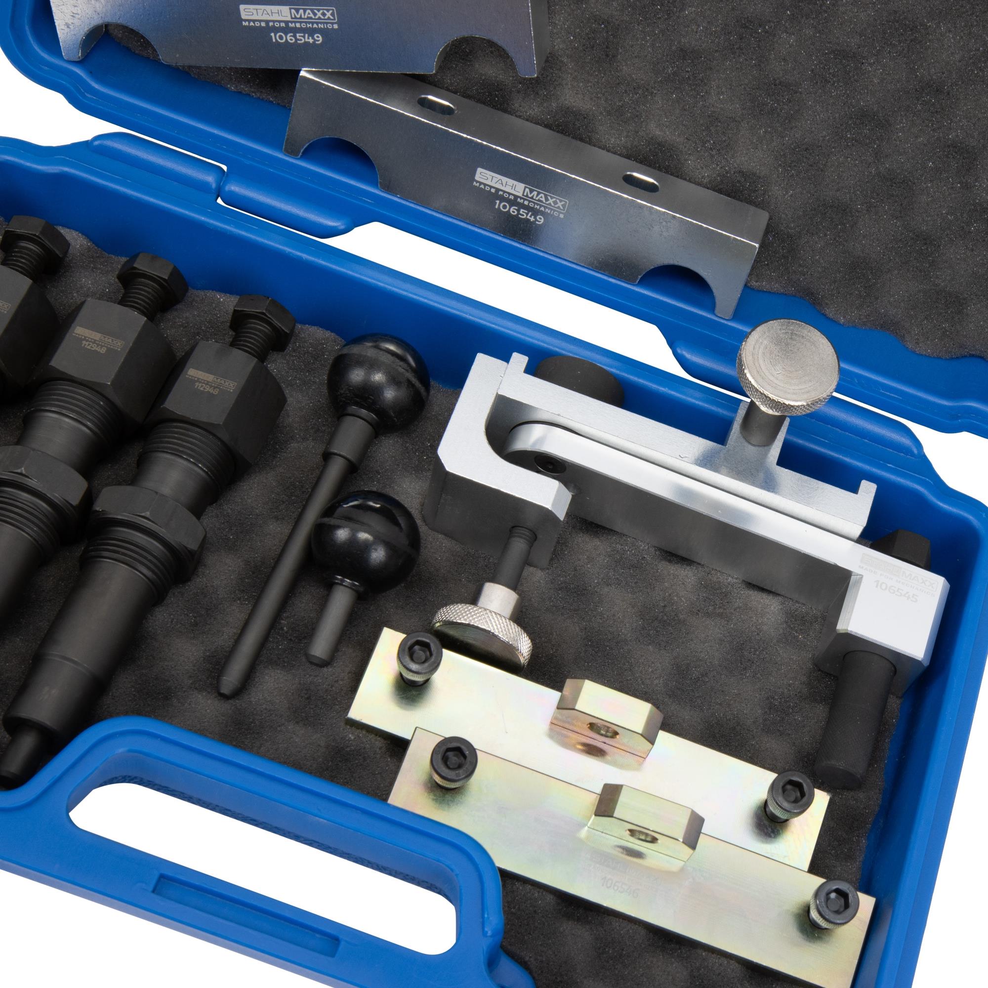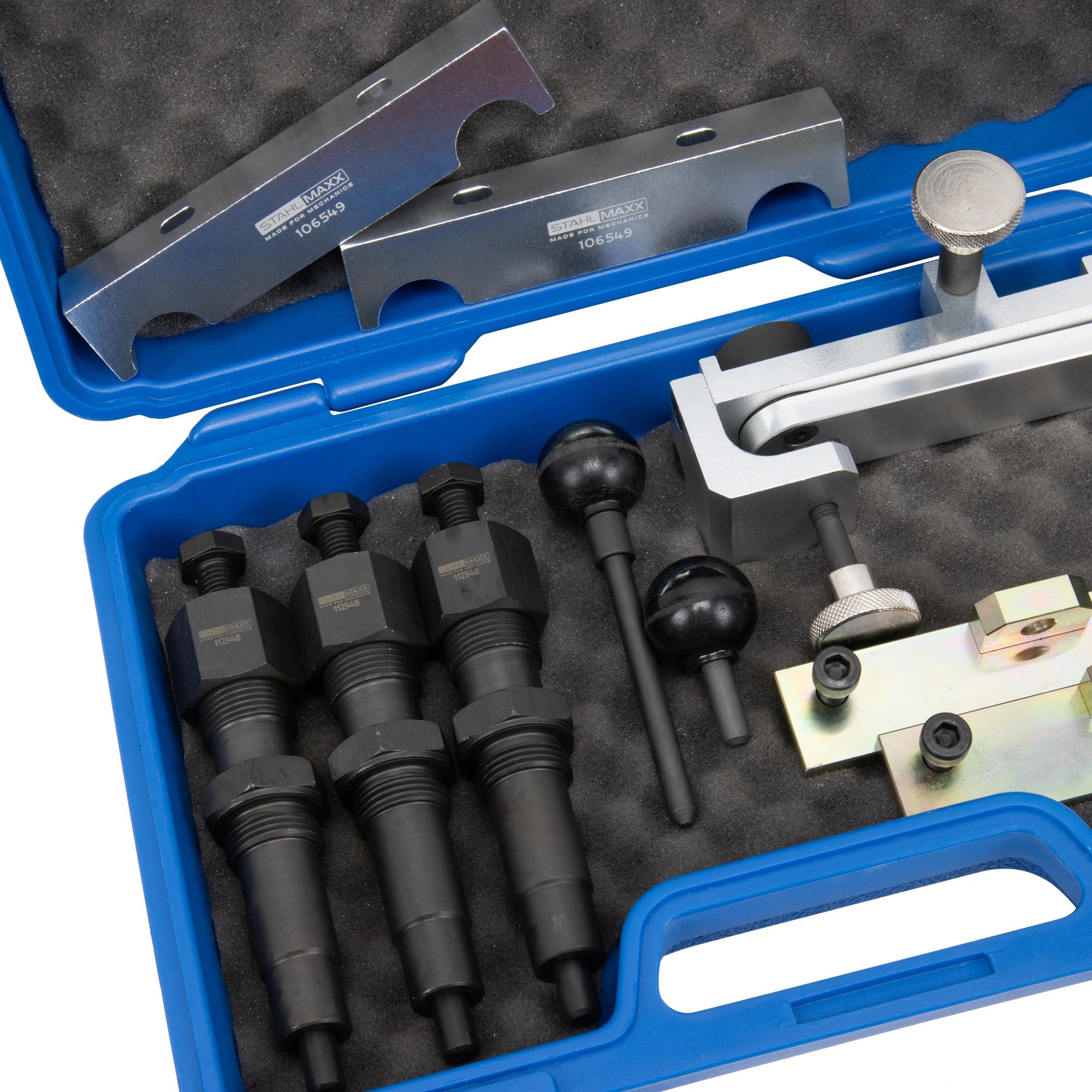 Mit unserem Werkzeugkit erhalten Sie alle benötigten Spezialwerkzeuge um den Motor professionell und zeitsparend instand setzen zu können und einen Steuerkettenwechsel oder einen Tausch der Zylinderkopfdichtung durchzuführen. Es sind die Werkzeuge enthalten um die Kurbelwelle abzustecken, die Kette vorzuspannen, die Nockenwelle herunterzudrücken und auch in der Steuerzeitenposition zu blockieren.