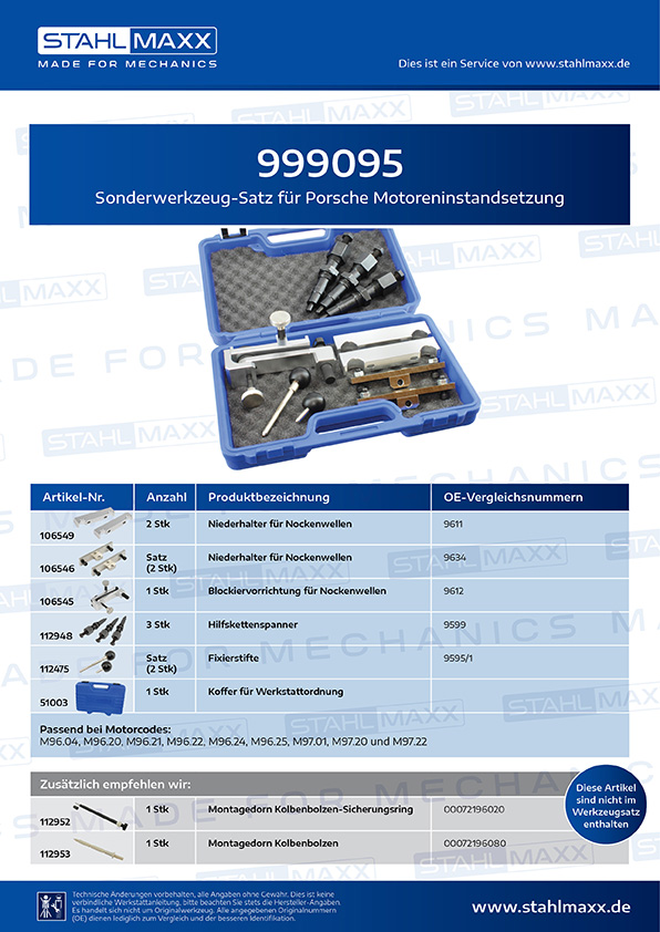Bitte beachten Sie, dass es sich hierbei nicht um Original Porsche Sonderwerkzeug handelt. Die angegebenen OE Nummern dienen dem Vergleich und der besseren Identifikation der für die Reparatur benötigten Spezialwerkzeuge