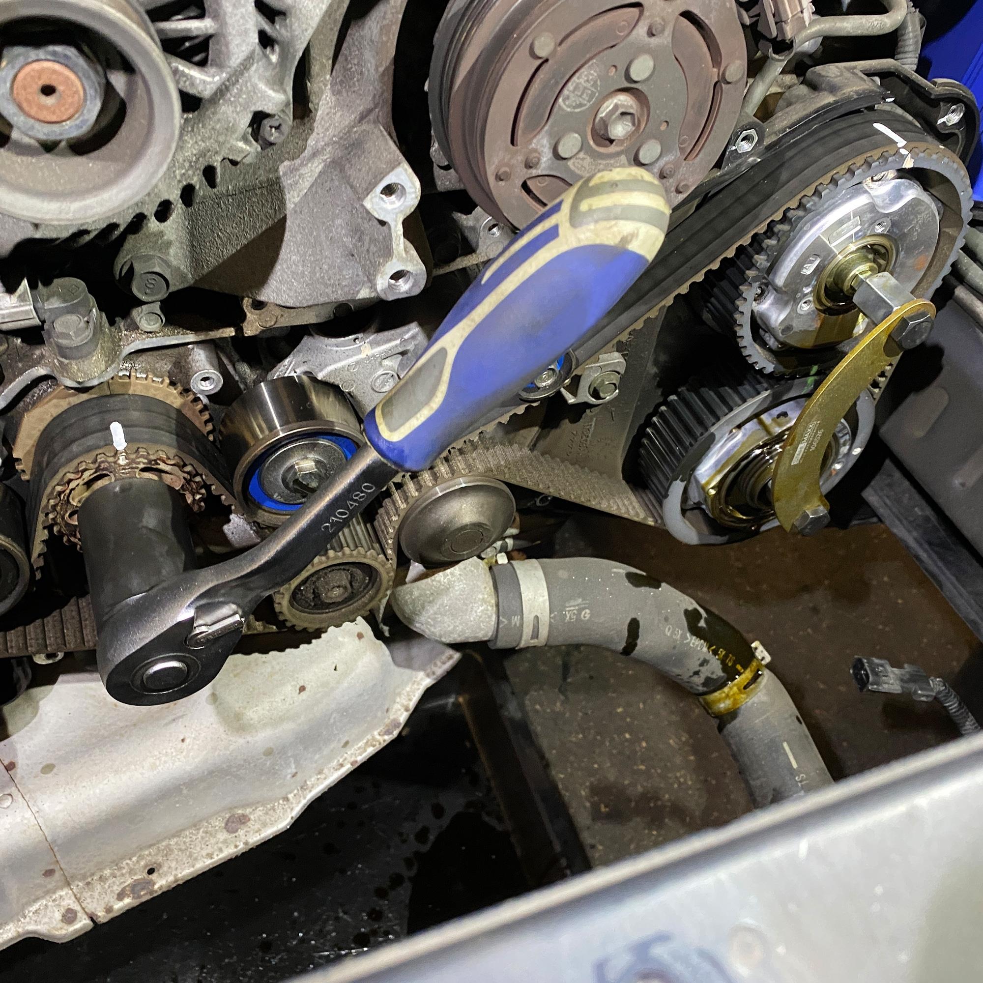 Inkl. Adapterring, für tief-ausgeformte Riemenscheiben – verhindert ein Kippen und ermöglicht ein festes Verschrauben, sowie der passenden Stecknuss zum Drehen der Kurbelwelle.