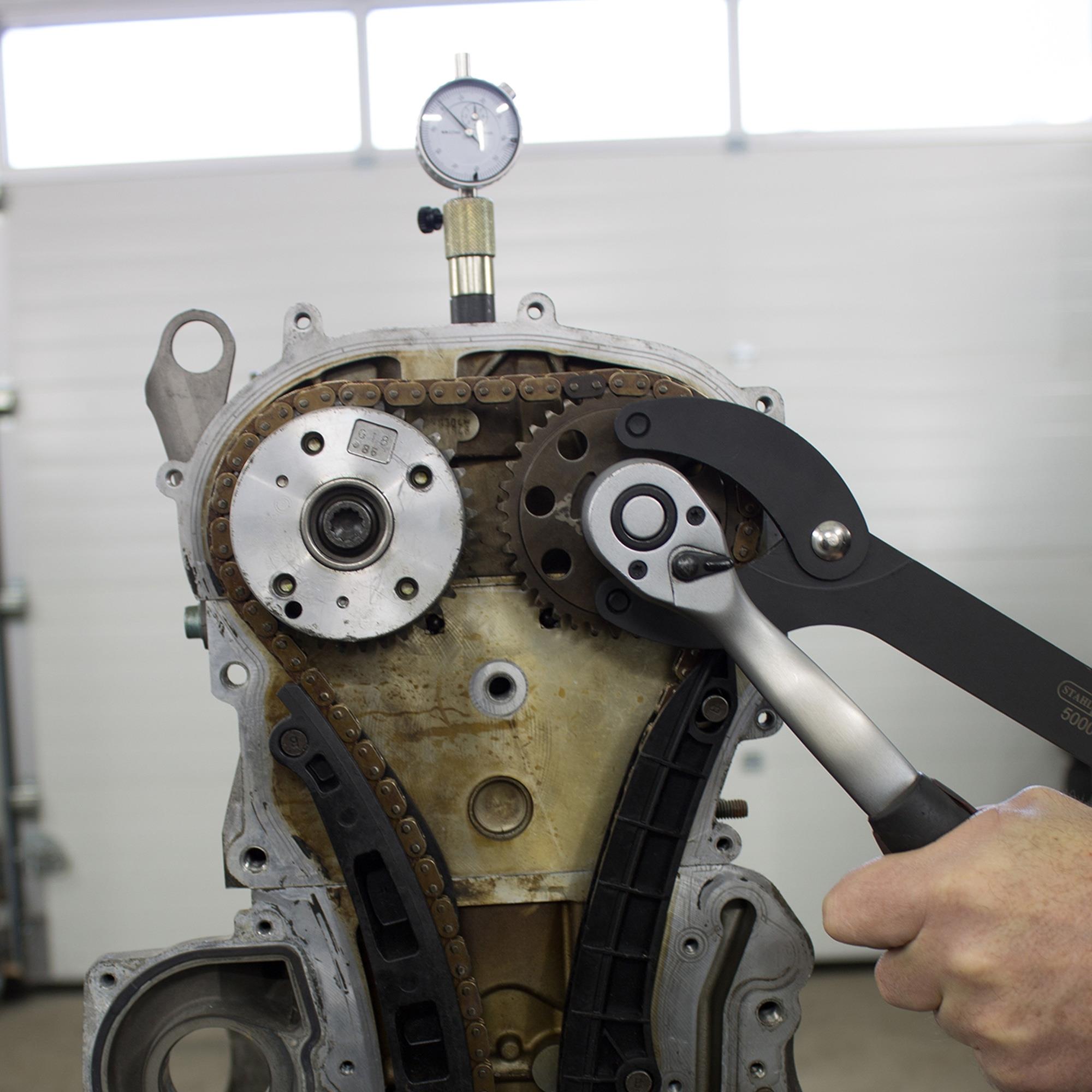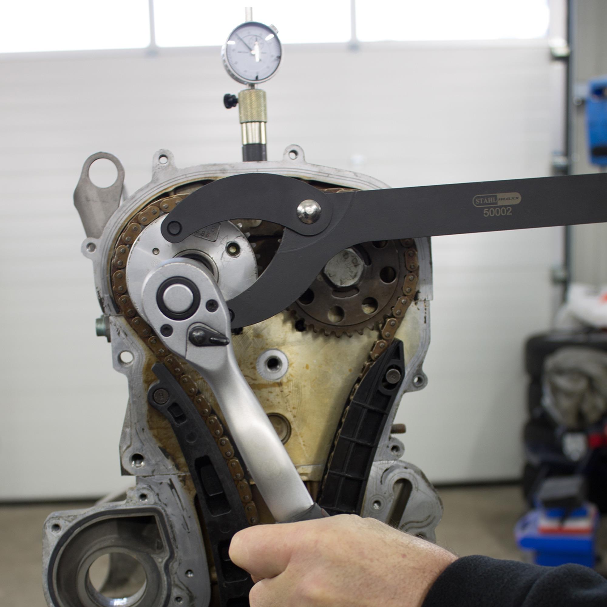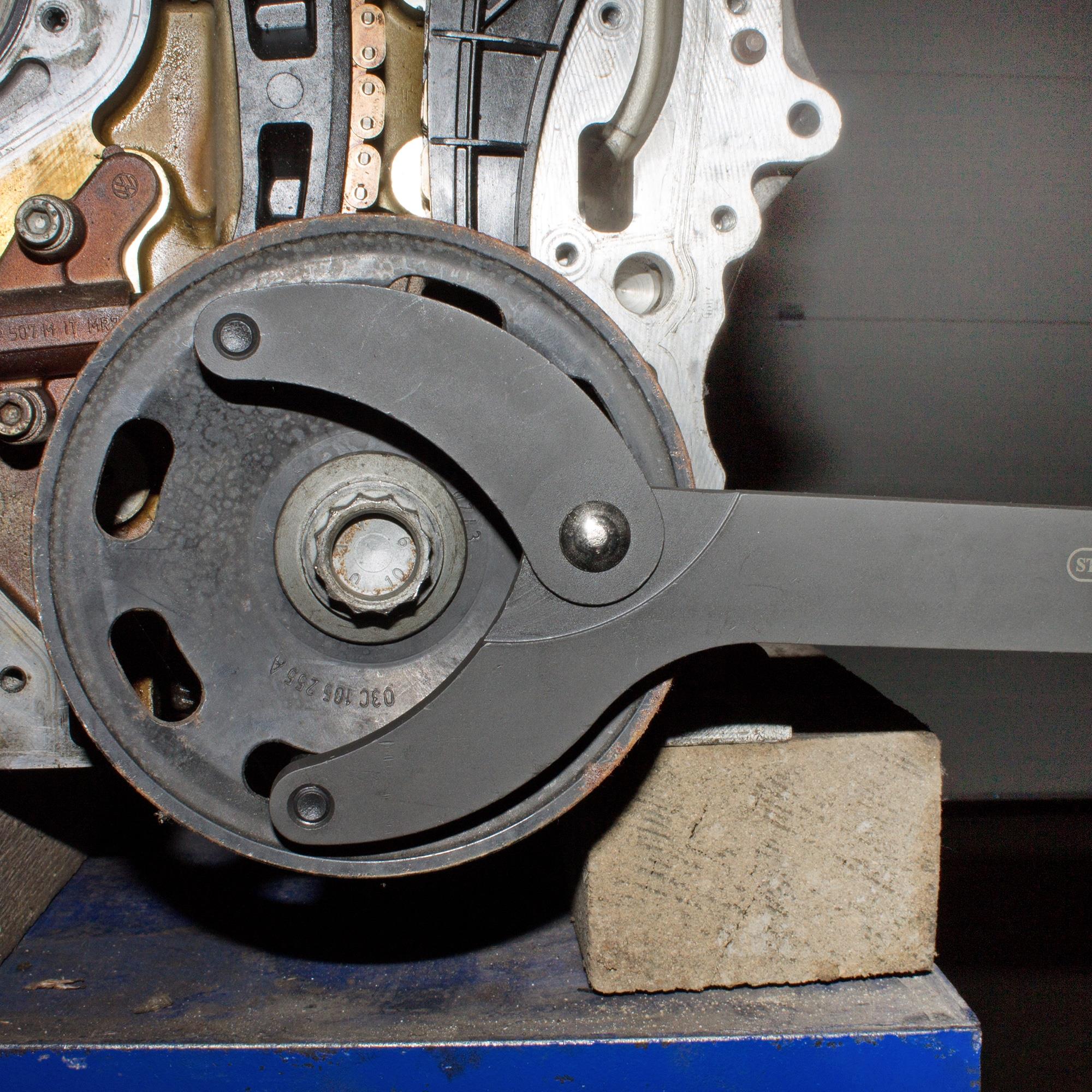 - Zum kontrollierten Gegenhalten von z.B. Steuerkettenräder, Zahnriemenräder und Riemenscheiben, während deren Befestigungsschrauben gelöst oder festgezogen werden.