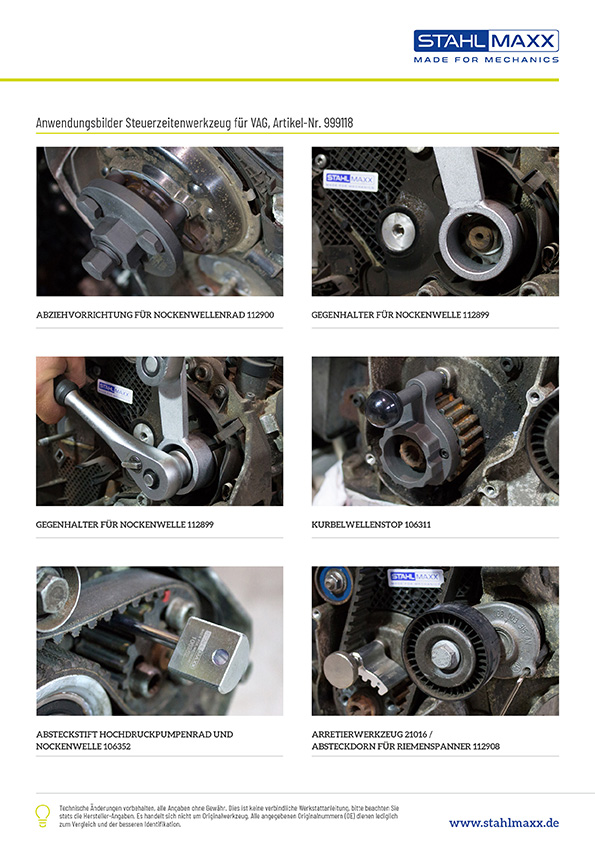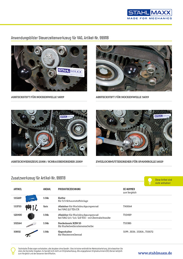 Nockenwellengegenhalter ist gut. Abzieher ist verbesserungswürdig. Beim festziehen der drei äußeren schrauben wird das zentrale Gewinde auf den Schraubenkopf gedrückt. Zieht man die äußeren Schrauben an, dann wird der Schraubenkopf ca. 2-3 mm in das Gewinde gepresst (Abhängig davon wie weit die Nockelwellenschraube gelöst wurde. Ich habe sie ca. 1,5-2 Umdrehungen gelöst). Das Gewinde wird entsprechen beschädigt. Abhilfe: Unterlegscheiben unter die drei äußeren Bolzen oder Zentralgewinde 5 mm tief mit einem größeren Durchmmesser nachbohren.