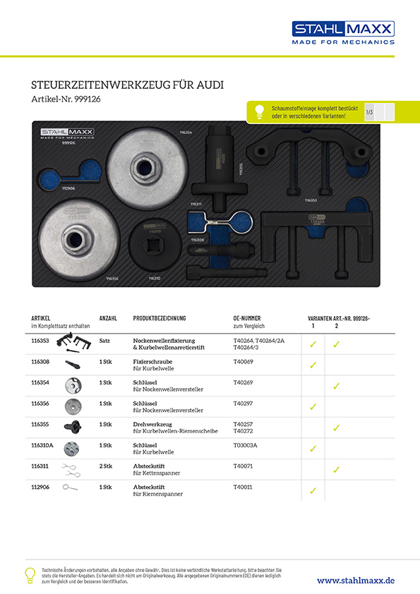 Dieses professionelle Spezialwerkzeug benötigen Sie für Instandsetzungsarbeiten im Bereich der Motorsteuerung bei den unten aufgeführten Audi-Motoren. Der Werkzeugsatz wird in einem robusten Koffer mit einer Schaumstoffeinlage in Carbon-Optik geliefert. Dieser beinhaltet Werkzeug zum Arretieren der Nockenwelle, Fixieren der Kurbelwelle, Vorspannen der Spannrolle etc. Die Schaumeinlage kann auch in gängige Werkstattwagen eingesetzt werden.