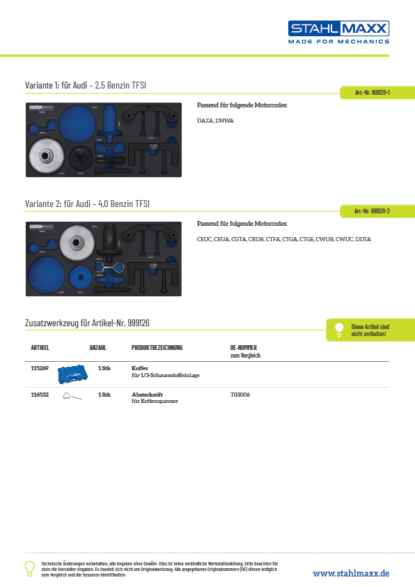 Der hier angebotene Komplettsatz (Art.-Nr. 999126) enthält alle Spezialwerkzeuge der Varianten 1 und 2. Die folgenden Varianten sind motorspezifisch zusammengestellt und auch als Einzelartikel erhältlich.
