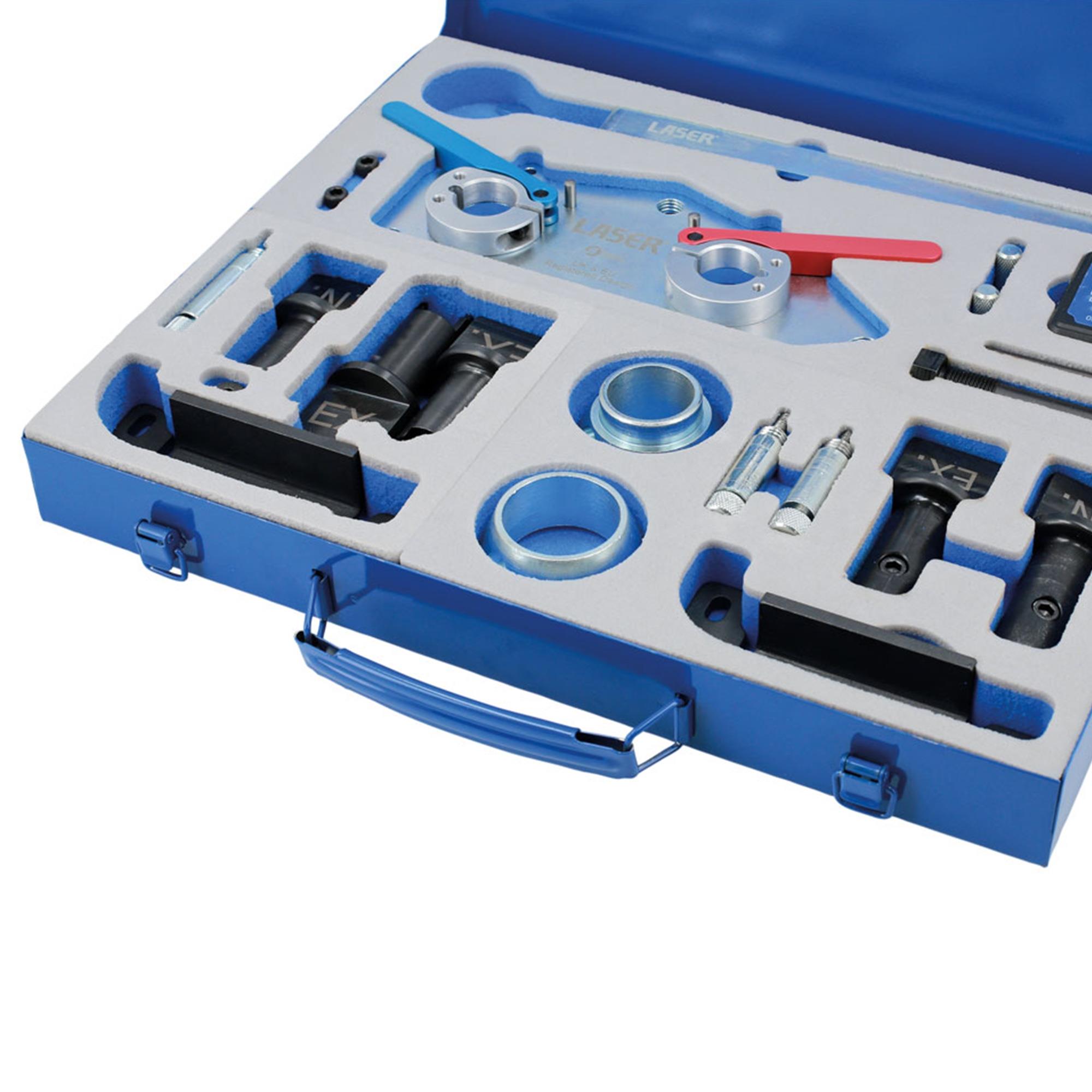 Der Werkzeugsatz beinhaltet alle aktuell benötigten Nockenwellen-Adapter zur elektronischen Grundeinstellung der Zahnriemen bei EA211 3-Zylinder und 4-Zylinder Motoren mit oder ohne Zylinderabschaltung (CoD & ACT).