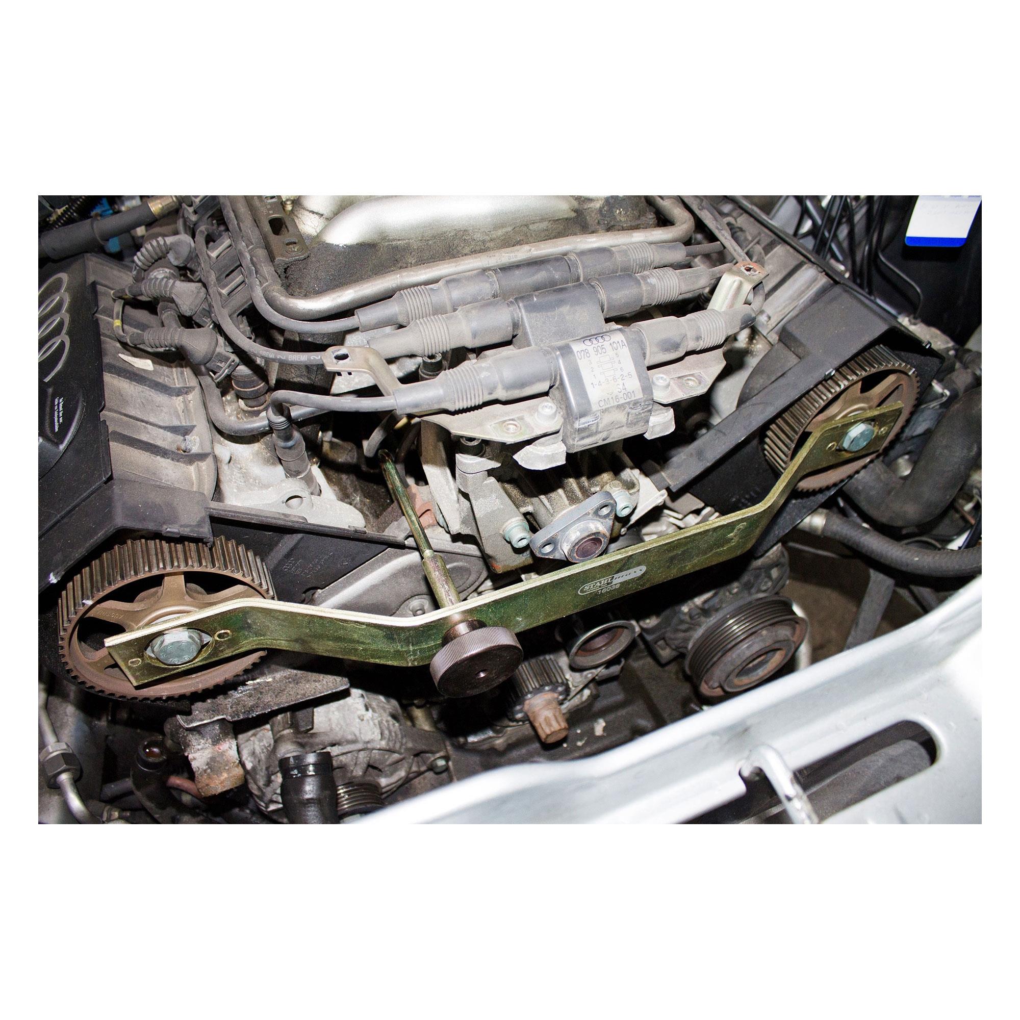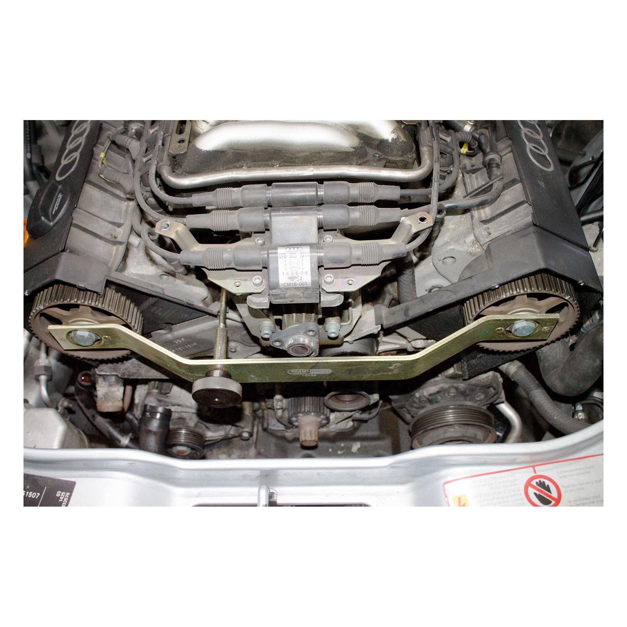 Arretierwerkzeug für die Nockenwellen bei Audi- und VW-Fahrzeugen mit 2,6 und 2,8 l bzw. 102-128 kW Motoren. 100%ige Passgenauigkeit sorgt für stressfreies Arbeiten am teueren und sensiblen Motor.